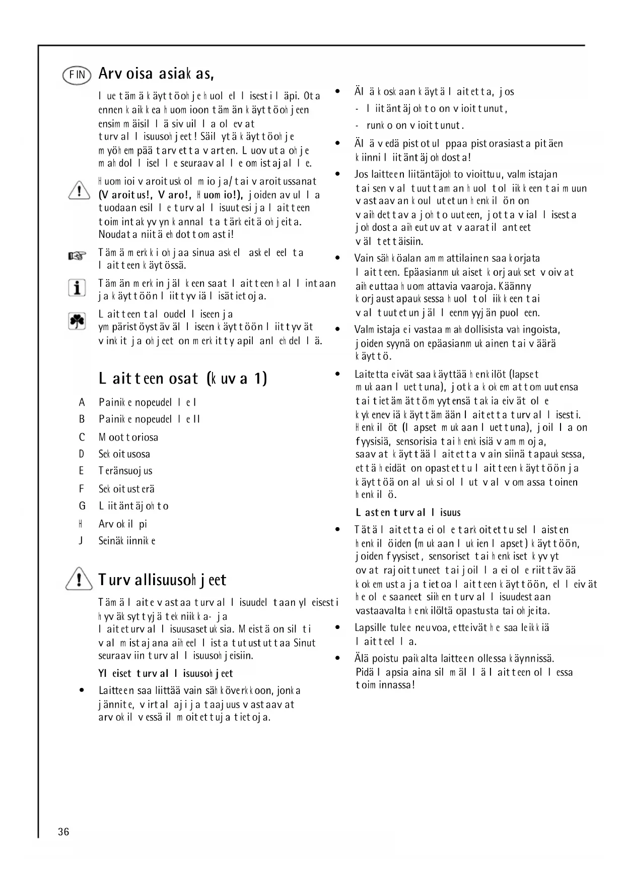- EM C- direk tiv 89 /336/EEG m ed ändringarna 9 2/31/EEG och 9 3/68/EEG36 Arvoisa asiak as, lue täm ä k äyttöoh je h uolellisesti läpi. Ota ennen k aik k ea h uom ioon täm än k äyttöoh jeen ensim m äisillä sivuilla olevat turvallisuusoh jeet! Säilytä k äyttöoh je m yöh em pää tarvetta varten. Luovuta oh je m ah dolliselle seuraavalle om istajalle. H uom ioi varoitusk olm io ja/tai varoitussanat (Varoitus!, Varo!, H uom io!), joiden avulla tuodaan esille turvallisuutesi ja laitteen toim intak yvyn k annalta tärk eitä oh jeita. Noudata niitä eh dottom asti! Täm ä m erk k i oh jaa sinua ask el ask eleelta laitteen k äytössä. Täm än m erk in jälk een saat laitteen h allintaan ja k äyttöön liittyviä lisätietoja. Laitteen taloudelliseen ja ym päristöystävälliseen k äyttöön liittyvät vink it ja oh jeet on m erk itty apilanleh dellä. Laitteen osat (k uva 1) A Painik e nopeudelle I B Painik e nopeudelle II C M oottoriosa D Sek oitusosa E Teränsuojus F Sek oitusterä G Liitäntäjoh to H Arvok ilpi J Seinäk iinnik e Turvallisuusoh jeet Täm ä laite vastaa turvallisuudeltaan yleisesti h yväk syttyjä tek niik k a- ja laiteturvallisuusasetuk sia. M eistä on silti valm istajana aih eellista tutustuttaa Sinut seuraaviin turvallisuusoh jeisiin. Yleiset turvallisuusoh jeet