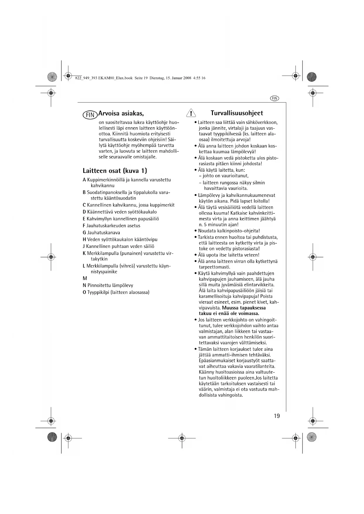 - Laitteen saa liittää vain sähköverkkoon, jonka jännite, virtalaji ja taajuus vas-taavat tyyppikilvessä (ks. laitteen ala-osaa) ilmoitettuja arvoja!• Älä anna laitteen johdon koskaan kos-kettaa kuumaa lämpölevyä!• Älä koskaan vedä pistoketta ulos pisto-rasiasta pitäen kiinni johdosta!• Älä käytä laitetta, kun:– johto on vaurioitunut,– laitteen rungossa näkyy silmin havaittavia vaurioita.• Lämpölevy ja kahvikannukuumenevat käytön aikana. Pidä lapset loitolla!• Älä täytä vesisäiliötä vedellä laitteen ollessa kuuma! Katkaise kahvinkeitti-mesta virta ja anna keittimen jäähtyä n. 5 minuutin ajan!• Noudata kalkinpoisto-ohjeita!• Tarkista ennen huoltoa tai puhdistusta, että laitteesta on kytketty virta ja pis-toke on vedetty pistorasiasta!• Älä upota itse laitetta veteen!• Älä anna laitteen virran olla kytkettynä tarpeettomasti.• Käytä kahvimyllyä vain paahdettujen kahvipapujen jauhamiseen, älä jauha sillä muita jyvämäisiä elintarvikkeita. Älä laita kahvipapusäiliöön jäisiä tai karamellisoituja kahvipapuja! Poista vieraat esineet, esim. pienet kivet, kah-vipavuista. Muussa tapauksessa takuu ei enää ole voimassa.• Jos laitteen verkkojohto on vahingoit-tunut, tulee verkkojohdon vaihto antaa valmistajan, alan liikkeen tai vastaa-van ammattitaitoisen henkilön suori-tettavaksi vaarojen välttämiseksi.• Tämän laitteen korjaukset tulee aina jättää ammatti-ihmisen tehtäväksi. Epäasianmukaiset korjaustyöt saatta-vat aiheuttaa vakavia vaaratilanteita. Käänny huoltoasioissa aina valtuute-tun huoltoliikkeen puoleen.Jos laitetta käytetään tarkoituksen vastaisesti tai väärin, valmistaja ei ota vastuuta mah-dollisista vahingoista.822_949_393 EKAM80_Elux.book Seite 19 Dienstag, 15. Januar 2008 4:55 16q