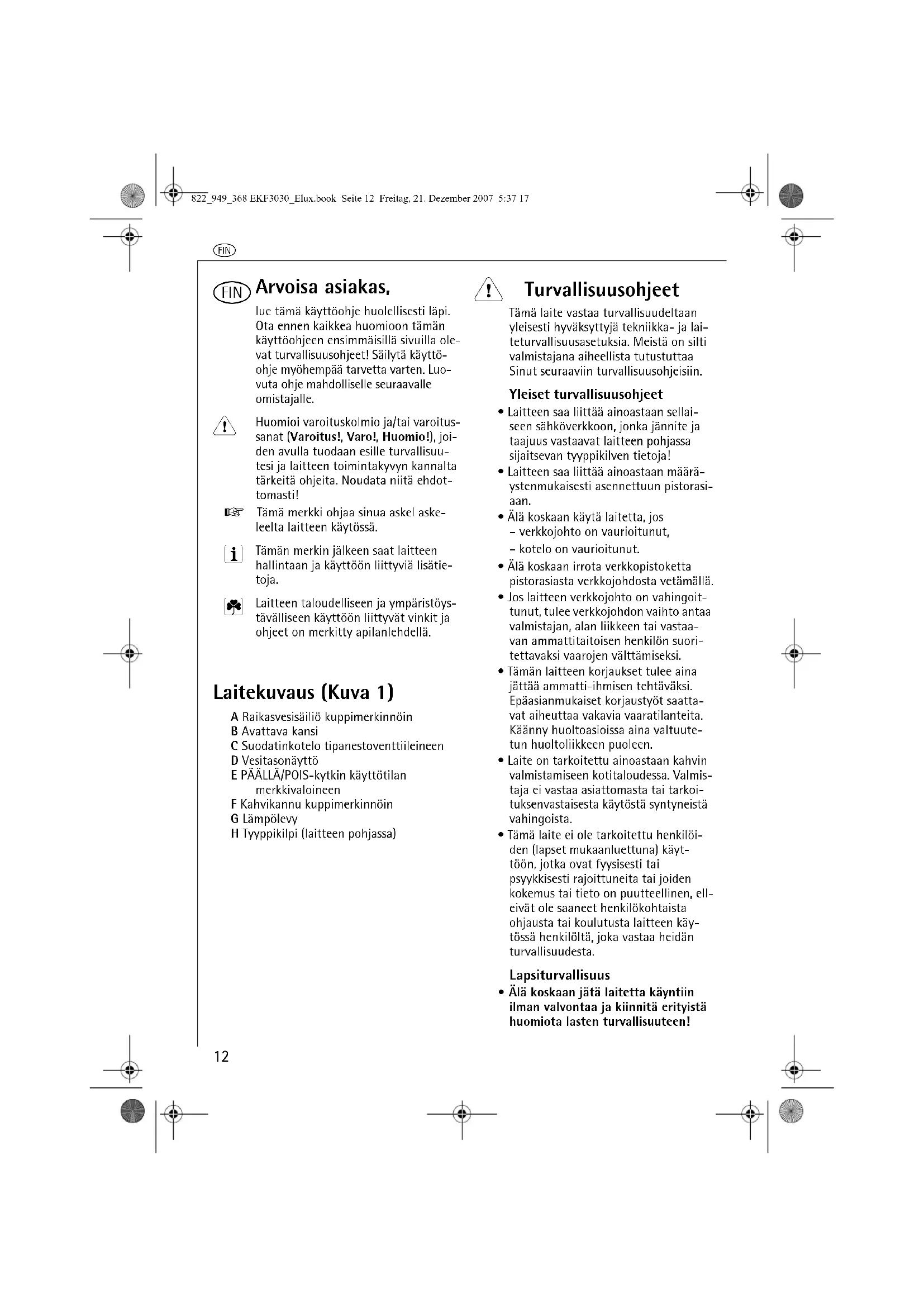 - Älä koskaan käytä laitetta, jos– verkkojohto on vaurioitunut,– kotelo on vaurioitunut.• Älä koskaan irrota verkkopistoketta pistorasiasta verkkojohdosta vetämällä.• Jos laitteen verkkojohto on vahingoit-tunut, tulee verkkojohdon vaihto antaa valmistajan, alan liikkeen tai vastaa-van ammattitaitoisen henkilön suori-tettavaksi vaarojen välttämiseksi.• Tämän laitteen korjaukset tulee aina jättää ammatti-ihmisen tehtäväksi. Epäasianmukaiset korjaustyöt saatta-vat aiheuttaa vakavia vaaratilanteita. Käänny huoltoasioissa aina valtuute-tun huoltoliikkeen puoleen.• Laite on tarkoitettu ainoastaan kahvin valmistamiseen kotitaloudessa. Valmis-taja ei vastaa asiattomasta tai tarkoi-tuksenvastaisesta käytöstä syntyneistä vahingoista.• Tämä laite ei ole tarkoitettu henkilöi-den (lapset mukaanluettuna) käyt-töön, jotka ovat fyysisesti tai psyykkisesti rajoittuneita tai joiden kokemus tai tieto on puutteellinen, ell-eivät ole saaneet henkilökohtaista ohjausta tai koulutusta laitteen käy-tössä henkilöltä, joka vastaa heidän turvallisuudesta.Lapsiturvallisuus• Älä koskaan jätä laitetta käyntiin ilman valvontaa ja kiinnitä erityistä huomiota lasten turvallisuuteen!822_949_368 EKF3030_Elux.book Seite 12 Freitag, 21. Dezember 2007 5:37 17q