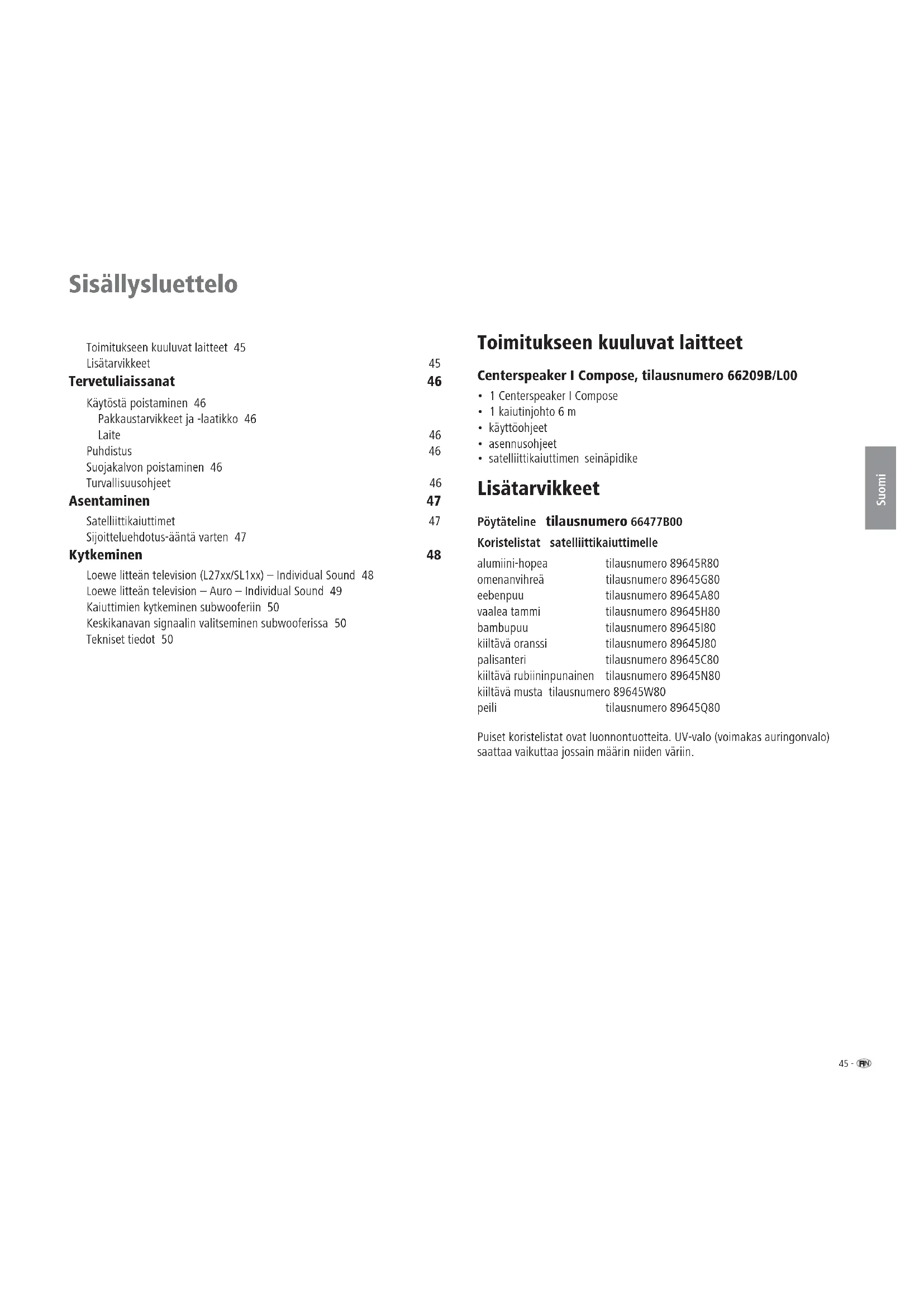 Bass IntensityPhaseMin. Max.0 180Crossover FrequencyAudio LinkSystem connector50 250. Front venstre Front højre Surround venstre Surround højre Subwoofer Center45 - Suomi Sisällysluettelo Toimitukseen kuuluvat laitteet 45 Lisätarvikkeet 45 Tervetuliaissanat 46 Käytöstä poistaminen 46 Pakkaustarvikkeet ja -laatikko 46 Laite 46 Puhdistus 46 Suojakalvon poistaminen 46 Turvallisuusohjeet 46 Asentaminen 47 Satelliittikaiuttimet 47 Sijoitteluehdotus-ääntä varten 47 Kytkeminen 48 Loewe litteän television (L27xx/SL1xx) – Individual Sound 48 Loewe litteän television – Auro – Individual Sound 49 Kaiuttimien kytkeminen subwooferiin 50 Keskikanavan signaalin valitseminen subwooferissa 50 Tekniset tiedot 50 Toimitukseen kuuluvat laitteet Centerspeaker I Compose, tilausnumero 66209B/L00