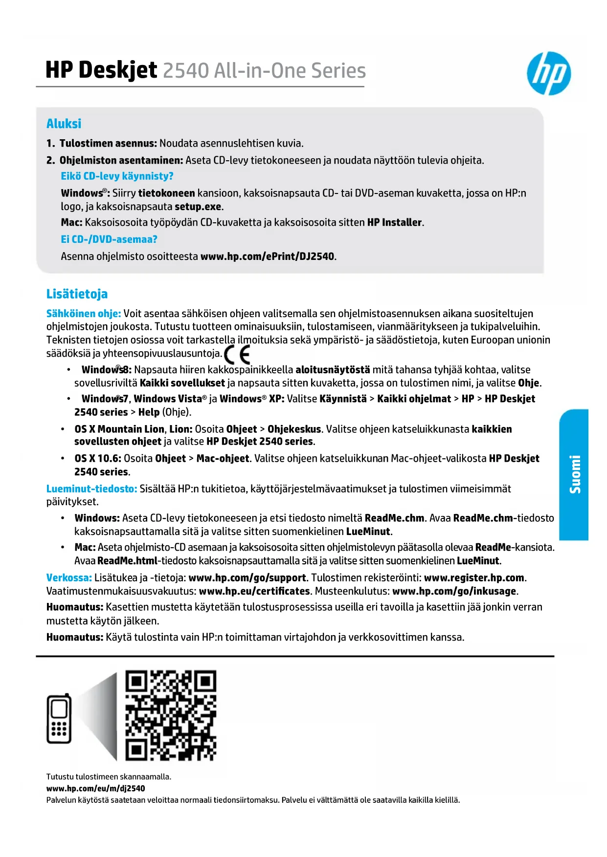 : Siirry tietokoneen kansioon, kaksoisnapsauta CD- tai DVD-aseman kuvaketta, jossa on HP:n logo, ja kaksoisnapsauta setup.exe. Mac: Kaksoisosoita työpöydän CD-kuvaketta ja kaksoisosoita sitten HP Installer. Ei CD-/DVD-asemaa? Asenna ohjelmisto osoitteesta www.hp.com/ePrint/DJ2540. Lisätietoja Sähköinen ohje: Voit asentaa sähköisen ohjeen valitsemalla sen ohjelmistoasennuksen aikana suositeltujen ohjelmistojen joukosta. Tutustu tuotteen ominaisuuksiin, tulostamiseen, vianmääritykseen ja tukipalveluihin. Teknisten tietojen osiossa voit tarkastella ilmoituksia sekä ympäristö- ja säädöstietoja, kuten Euroopan unionin säädöksiä ja yhteensopivuuslausuntoja.
