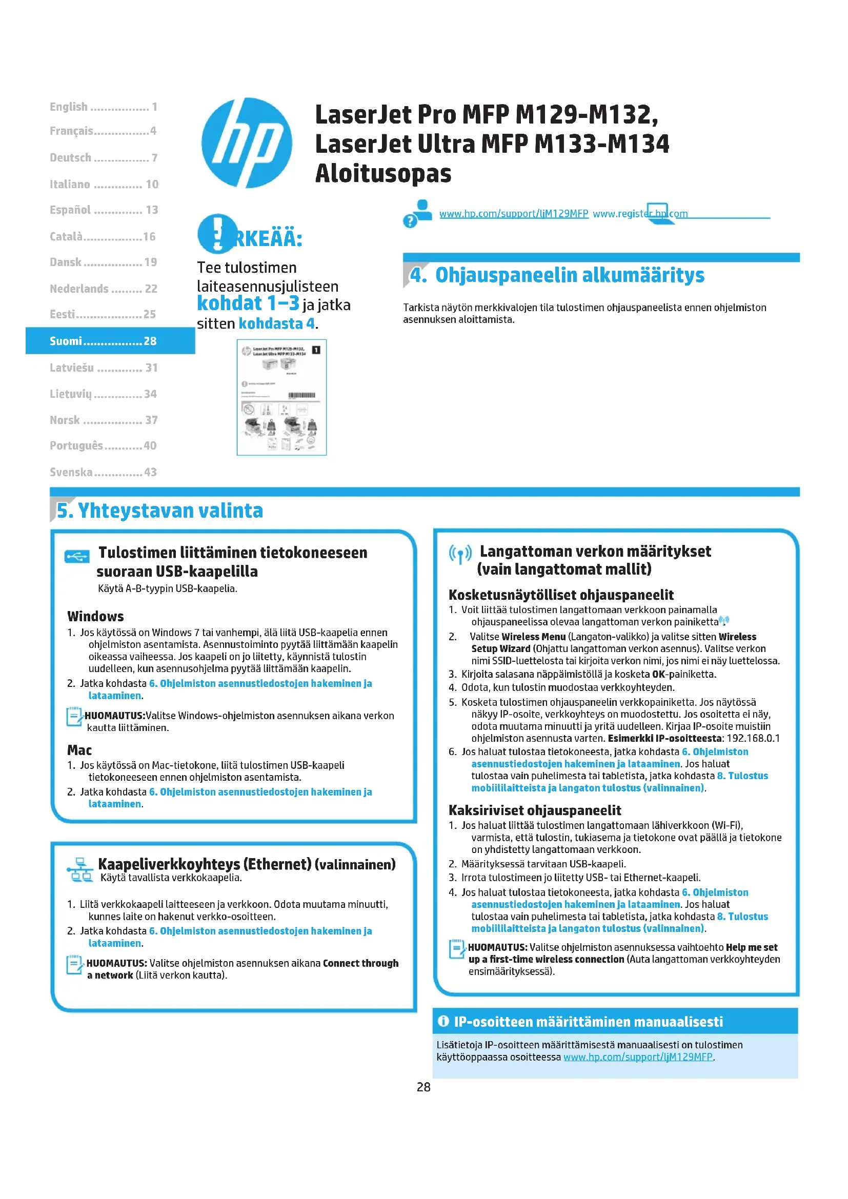 Setup Wizard (Ohjattu langattoman verkon asennus). Valitse verkon nimi SSID-luettelosta tai kirjoita verkon nimi, jos nimi ei näy luettelossa.3. Kirjoita salasana näppäimistöllä ja kosketa OK-painiketta.4. Odota, kun tulostin muodostaa verkkoyhteyden.5. Kosketa tulostimen ohjauspaneelin verkkopainiketta. Jos näytössä näkyy IP-osoite, verkkoyhteys on muodostettu. Jos osoitetta ei näy, odota muutama minuutti ja yritä uudelleen. Kirjaa IP-osoite muistiin ohjelmiston asennusta varten. Esimerkki IP-osoitteesta: 192.168.0.16. Jos haluat tulostaa tietokoneesta, jatka kohdasta 6. Ohjelmiston asennustiedostojen hakeminen ja lataaminen. Jos haluat tulostaa vain puhelimesta tai tabletista, jatka kohdasta 8. Tulostus mobiililaitteista ja langaton tulostus (valinnainen).Kaksiriviset ohjauspaneelit1. Jos haluat liittää tulostimen langattomaan lähiverkkoon (Wi-Fi), varmista, että tulostin, tukiasema ja tietokone ovat päällä ja tietokone on yhdistetty langattomaan verkkoon.2. Määrityksessä tarvitaan USB-kaapeli.3. Irrota tulostimeen jo liitetty USB- tai Ethernet-kaapeli.4. Jos haluat tulostaa tietokoneesta, jatka kohdasta 6. Ohjelmiston asennustiedostojen hakeminen ja lataaminen. Jos haluat tulostaa vain puhelimesta tai tabletista, jatka kohdasta 8. Tulostus mobiililaitteista ja langaton tulostus (valinnainen). HUOMAUTUS: Valitse ohjelmiston asennuksessa vaihtoehto Help me set up a rst-time wireless connection (Auta langattoman verkkoyhteyden ensimäärityksessä). Kaapeliverkkoyhteys (Ethernet) (valinnainen) Käytä tavallista verkkokaapelia.1. Liitä verkkokaapeli laitteeseen ja verkkoon. Odota muutama minuutti, kunnes laite on hakenut verkko-osoitteen.2. Jatka kohdasta 6. Ohjelmiston asennustiedostojen hakeminen ja lataaminen. HUOMAUTUS: Valitse ohjelmiston asennuksen aikana Connect through a network (Liitä verkon kautta).www.hp.com/support/ljM129MFP www.register.hp.com Tulostimen liittäminen tietokoneeseen suoraan USB-kaapelilla Käytä A-B-tyypin USB-kaapelia. TÄRKEÄÄ: Tee tulostimen laiteasennusjulisteen kohdat 1‒3 ja jatka sitten kohdasta 4.
