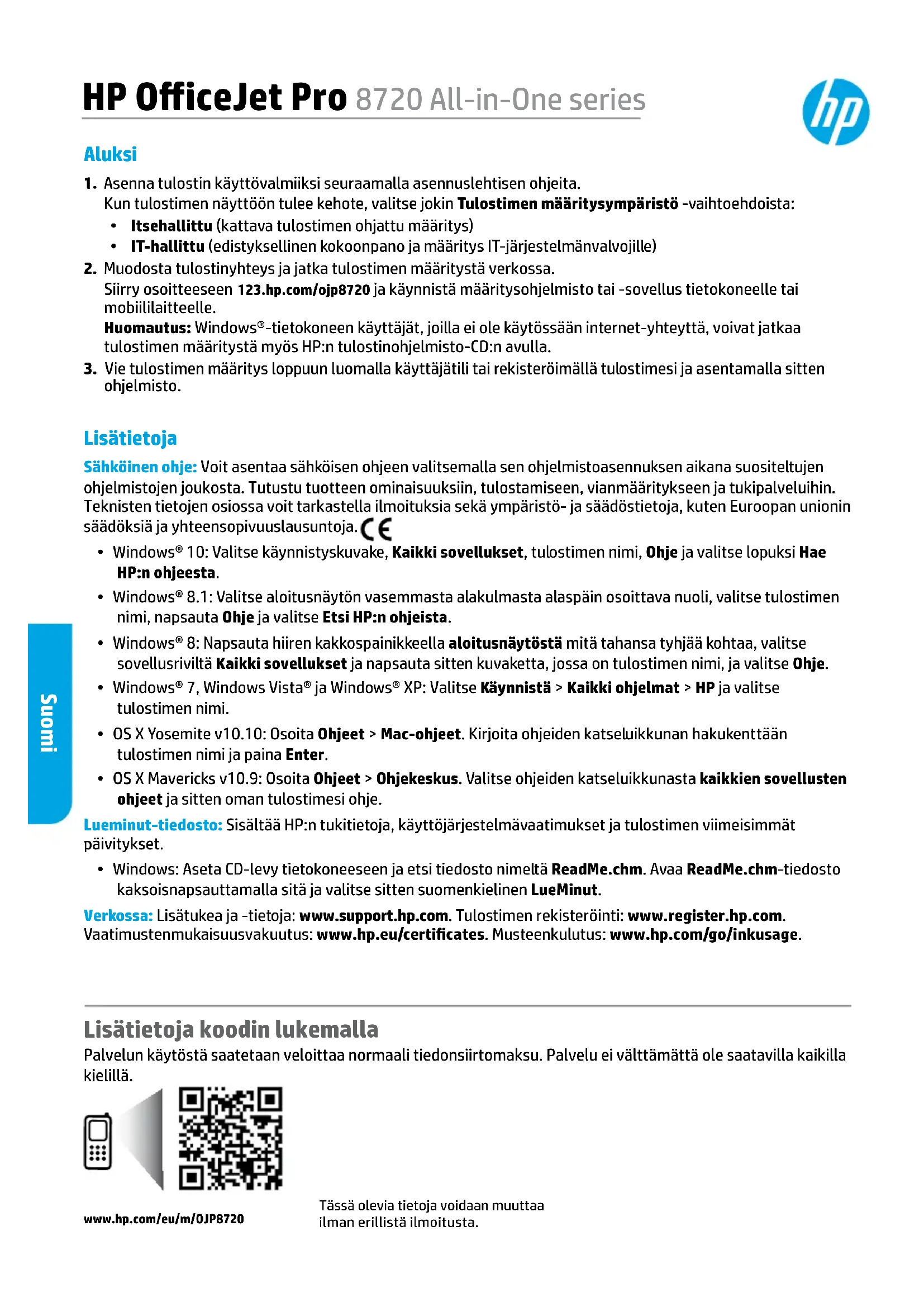 - Windows: Aseta CD-levy tietokoneeseen ja etsi tiedosto nimeltä ReadMe.chm. Avaa ReadMe.chm-tiedosto kaksoisnapsauttamalla sitä ja valitse sitten suomenkielinen LueMinut. Verkossa: Lisätukea ja -tietoja: www.support.hp.com. Tulostimen rekisteröinti: www.register.hp.com. Vaatimustenmukaisuusvakuutus: www.hp.eu/certicates. Musteenkulutus: www.hp.com/go/inkusage. Tässä olevia tietoja voidaan muuttaa ilman erillistä ilmoitusta. Lisätietoja koodin lukemalla Palvelun käytöstä saatetaan veloittaa normaali tiedonsiirtomaksu. Palvelu ei välttämättä ole saatavilla kaikilla kielillä.www.hp.com/eu/m/OJP8720 Suomi63 Langaton Mikäli noudatit tulostimen ohjauspaneelin ohjeita ja asensit HP:n tulostinohjelmiston, tulostin on nyt yhdistetty langattomaan verkkoon. Huomautus: Jos haluat muuttaa tulostimen käyttämää yhteystyyppiä (esimerkiksi USB:stä langattomaan tai päinvastoin), sinun on käytettävä HP:n tulostinohjelmiston mukana toimitettuja työkaluja. Vinkki: Wi-Fi Direct -toiminnon avulla voi tulostaa langattomasti tietokoneelta, älypuhelimelta, tabletilta tai muulta langatonta yhteyttä käyttävältä laitteelta ilman yhteyttä muuhun langattomaan verkkoon. Katso lisätietoja sähköisen ohjeen kohdista Yhteystyypin vaihtaminen ja Wi-Fi Directin käyttäminen (katso "Lisätietoja" sivulta 62). Langattoman verkon ongelmien ratkaiseminen