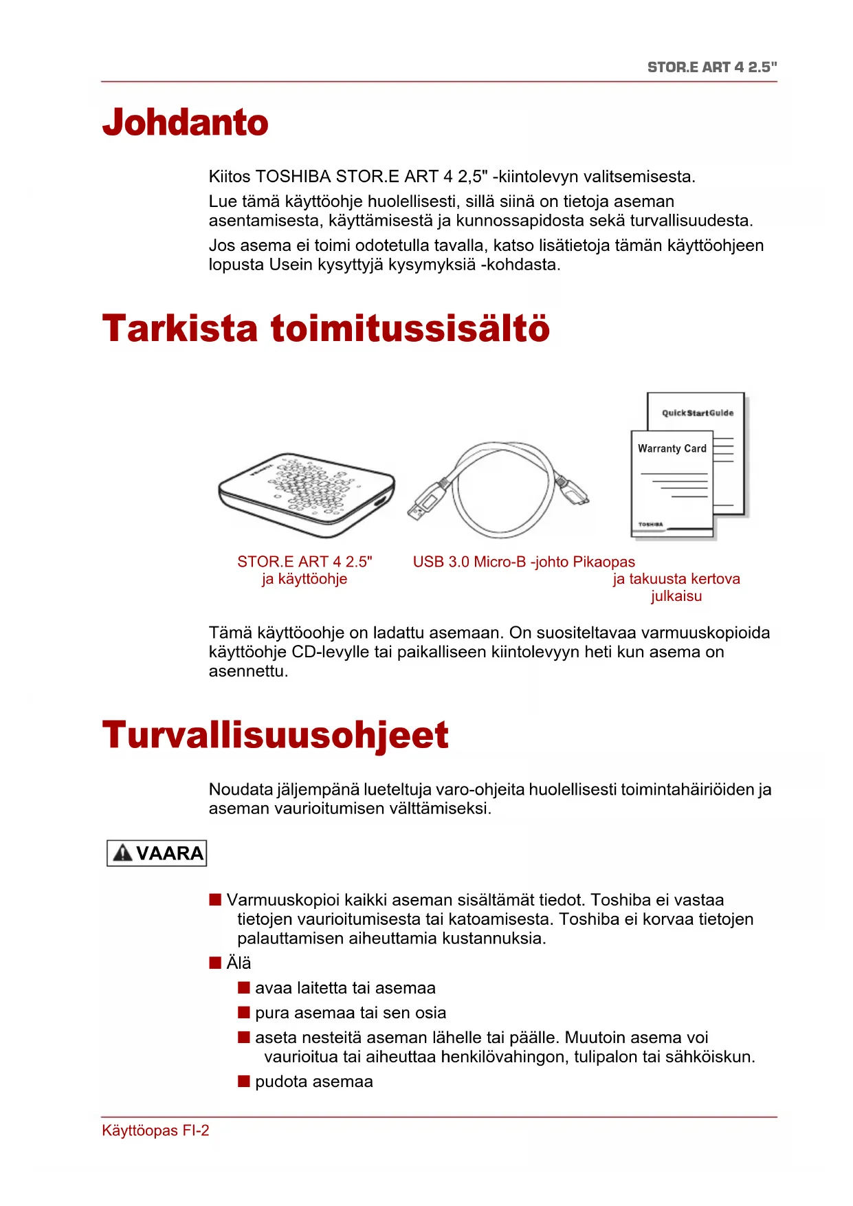 ja käyttöohje USB 3.0 Micro-B -johto Pikaopas ja takuusta kertova julkaisu VAARAKäyttöopas FI-3