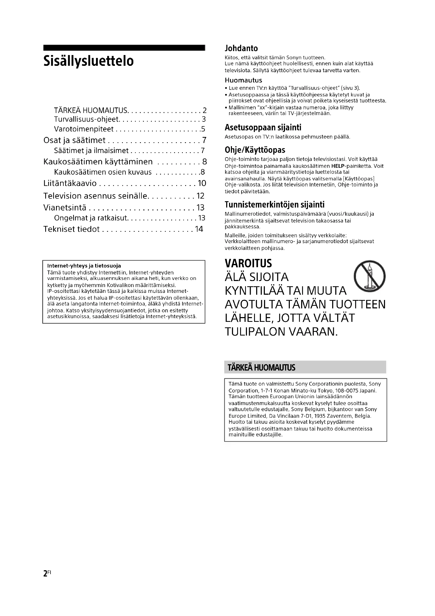 D:\SONY TV\SY17_KF_EU_RG_121\Group_KF_EU_RG_121\4684583121\4684583121\10_4684583121_FI\010 COVTOC_FI.fm masterpage: Right KD-55XE83xx / 55XE80xx / 49XE83xx / 49XE80xx / 43XE83xx / 43XE80xx / FW-55XE80xx / 49XE80xx / 43XE80xx 4-684-583-12(1) Langattomaan signaaliin liittyvä huomautus Sony Corporation vakuuttaa täten että tyyppinen laite on direktiivin 1999/5/EY oleellisten vaatimusten ja sitä koskevien direktiivin muiden ehtojen mukainen. Halutessasi lisätietoja, käy osoitteessa: http://www.compliance.sony.de/ Huomautus asiakkaille: seuraavat tiedot koskevat ainoastaan laitteita, joita myydään EU:n direktiivejä noudattavissa maissa. Langatonta televisiojärjestelmää voi käyttää seuraavissa maissa: AT, BE, HR, CY, CZ, DK, EE, FI, FR, DE, EL, HU, IE, IT, LV, LT, LU, MT, NL, PL, PT, SK, SI, ES, SE, UK, IS, LI, NO, CH, BG, RO, TR, AL, BA, MK, MD, RS, ME, Kosovo Tätä laitetta voidaan käyttää muissa Euroopan ulkopuolisissa maissa. Tätä radiolaitetta voidaan käyttää EU:n alueella loukkaamatta sovellettavia vaatimuksia radiotaajuuksien käytöstä. VAROITUS Älä jätä paristoja alttiiksi kuumuudelle, kuten auringonpaisteelle tai avotulelle. Älä koskaan sijoita televisiota epävakaaseen paikkaan. Televisio saattaa pudota ja aiheuttaa vakavan loukkaantumisen tai kuoleman. Usein erityisesti lasten loukkaantuminen voidaan välttää noudattamalla seuraavia yksinkertaisia varotoimia: Käytä television valmistajan suosittelemaa kaappia tai jalustaa. Käytä vain huonekaluja, jotka kantavat television painon turvallisesti. Varmista, että televisio ei ulotu sen alla olevan huonekalun reunojen ulkopuolelle. Älä sijoita televisiota korkean huonekalun päälle (esimerkiksi kaappi tai kirjahylly) kiinnittämättä huonekalua ja televisiota soveltuvaan tukeen. Älä aseta television ja sen alustan väliin liinoja tai muita materiaaleja. Opeta lapsille, että huonekalujen päälle kiipeäminen televisioon tai sen säätimiin ulottumiseksi on vaarallista. Jos säilytät vanhan televisiosi ja siirrät sen toiseen paikkaan, huomioi samat seikat sen sijoittelussa. Asennus ja käyttö Noudata television asennuksessa ja käytössä seuraavia ohjeita välttääksesi tulipalon tai sähköiskun vaaran tai laitteen vaurioitumisen ja/tai henkilövahingot. Asennus