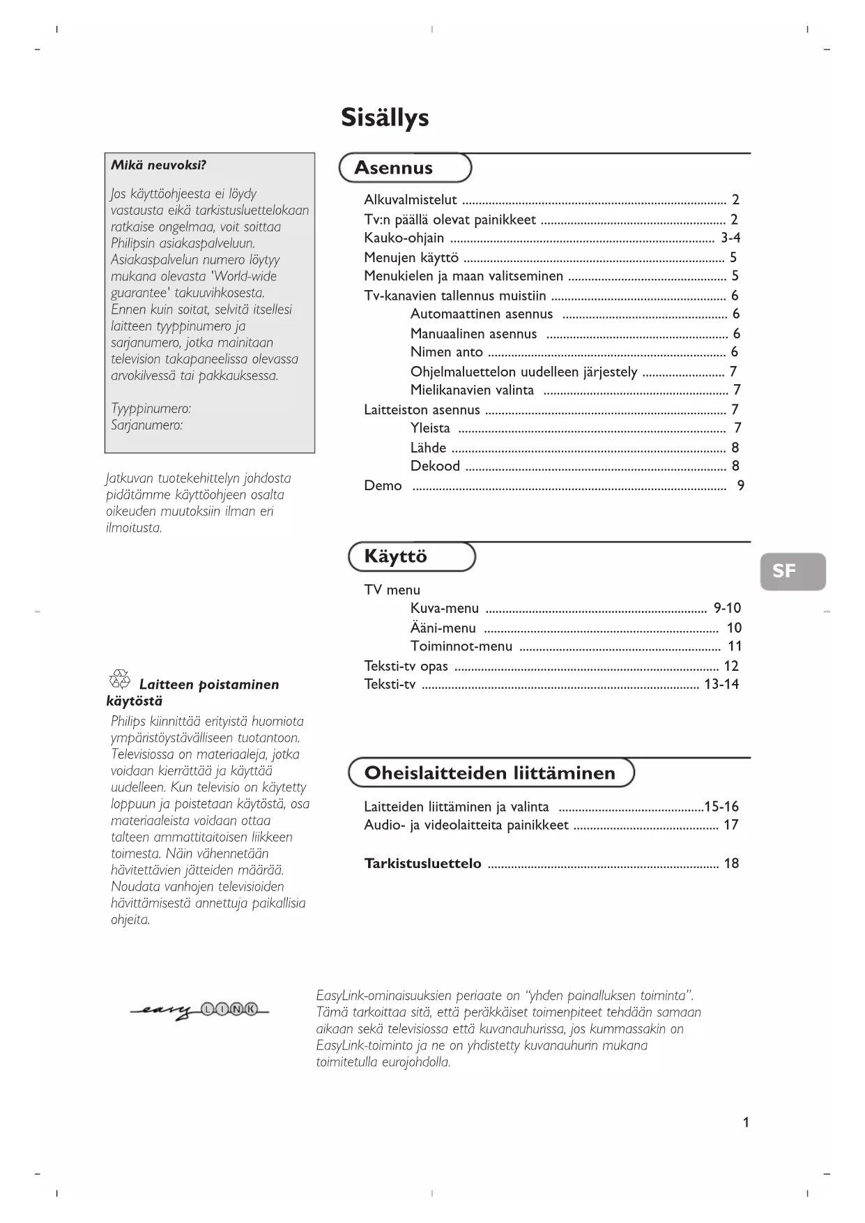 Laitteen poistaminen käytöstä Philips kiinnittää erityistä huomiota ympäristöystävälliseen tuotantoon. Televisiossa on materiaaleja, jotka voidaan kierrättää ja käyttää uudelleen. Kun televisio on käytetty loppuun ja poistetaan käytöstä, osa materiaaleista voidaan ottaa talteen ammattitaitoisen liikkeen toimesta. Näin vähennetään hävitettävien jätteiden määrää. Noudata vanhojen televisioiden hävittämisestä annettuja paikallisia ohjeita. Mikä neuvoksi? Jos käyttöohjeesta ei löydy vastausta eikä tarkistusluettelokaan ratkaise ongelmaa, voit soittaa Philipsin asiakaspalveluun. Asiakaspalvelun numero löytyy mukana olevasta 'World-wide guarantee' takuuvihkosesta. Ennen kuin soitat, selvitä itsellesi laitteen tyyppinumero ja sarjanumero, jotka mainitaan television takapaneelissa olevassa arvokilvessä tai pakkauksessa. Tyyppinumero: Sarjanumero: Jatkuvan tuotekehittelyn johdosta pidätämme käyttöohjeen osalta oikeuden muutoksiin ilman eri ilmoitusta. SF2 & Aseta televisio tukevalle alustalle. Jätä joka puolelle television ympärille vähintään 5 cm tyhjää ilmanvaihtoa varten. Älä laita televisiota maton päälle. Älä laita television päälle mitään, ettei niistä aiheudu vikoja tai vaaraa. Suojaa tv kuumuudelta ja auringonpaisteelta sekä sateelta ja vedeltä. é Liitä antennipistoke kunnolla television takana olevaan antenniliitäntään x. “ Liitä verkkopistoke pistorasiaan, jonka verkkojännite on 220V-240V. ‘ Kauko-ohjain: Pane lokeroon mukana olevat kaksi paristoa (tyyppi R6-1,5V). Mukana olevat paristot eivät sisällä elohopeaa eivätkä kadmiumia. Suosittelemme noudatettavaksi vanhojen paristojen hävittämisestä annettuja paikallisia ohjeita. ( Television kytkentä: Paina television edessä olevaa virtakytkintä A. Television edessä oleva merkkivalo ja kuvaruutu syttyvät. Jos merkkivalo on punainen, paina kauko-ohjaimesta painiketta - P+ tai B. Alkuvalmistelut