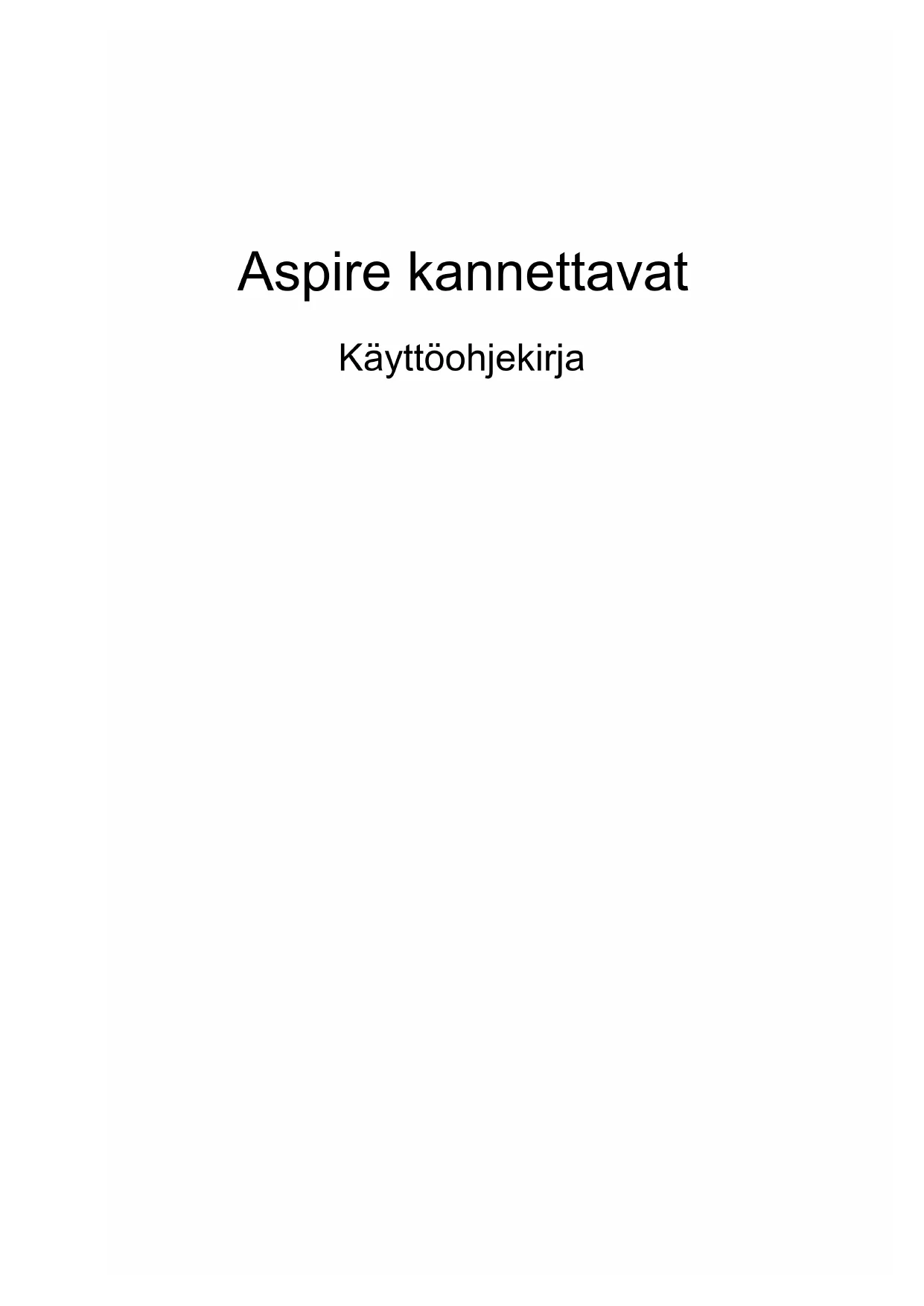 - v'n Pixel fault class Class II Part no.: Ver.: 01.01.06Aspire kannettavat KäyttöohjekirjaMallinumero: _________________________ Sarjanumero: _________________________ Ostopäivämäärä: ______________________ Ostopaikka: __________________________ © 2012 Kaikki oikeudet pidätetään. Aspire kannettavat-käyttöohjeesta Tämä versio: 01/2013iii Suomi Tietoja turvallisuuttasi ja mukavuuttasi varten Tärkeitä turvallisuusohjeita Lue nämä ohjeet huolellisesti. Säästä ohjeet tulevaisuutta varten. Säilytä tämä asiakirja tulevaa käyttöä varten. Noudata kaikkia laitteeseen merkittyjä määräyksiä ja ohjeita. Tuotteen sammuttaminen ennen puhdistamista Irrota laite pistorasiasta ennen sen puhdistamista. Älä käytä puhdistukseen nestemäisiä pesuaineita. Puhdista laite kostealla rievulla. VAROITUS kytkemisestä irrotettavana laitteena Huomaa seuraavat ohjeet virtalähteen virran kytkemisestä, sekä irroituksesta: Aseta virtalähde-yksikkö ennen virtajohdon liittämistä vaihtovirtapistorasiaan. Irroita virtajohto ennen virtalähde-yksikön irroitusta tietokoneesta. Jos laitteessa on useampia virtalähteitä, irroita kaikkien virtalähteiden virtajohdot. VAROITUS käsiksipääsystä Varmista, että virtaliitin, johon liität virtajohdon, on helposti käsiksi päästävissä, ja sijaitsee mahdollisimman lähellä laitteiston käyttäjää. Kun haluat katkaista virran laitteistosta, varmista että irroitat virtajohdon virtaliittimisetä. VAROITUS mukana toimitetuista täytekortista(-korteista) (vain tietyille malleille) Tietokoneesi on toimitettu täytekorttien kanssa, jotka on asetettu korttipaikkoihin. Täytekortit suojaavat käyttämättömiä korttipaikkoja pölyltä, metalliesineiltä, ja muulta lialta. Säilytä täytekortit, jotta voit käyttää niitä, kun korttipaikoissa ei ole kortteja. Varoitus