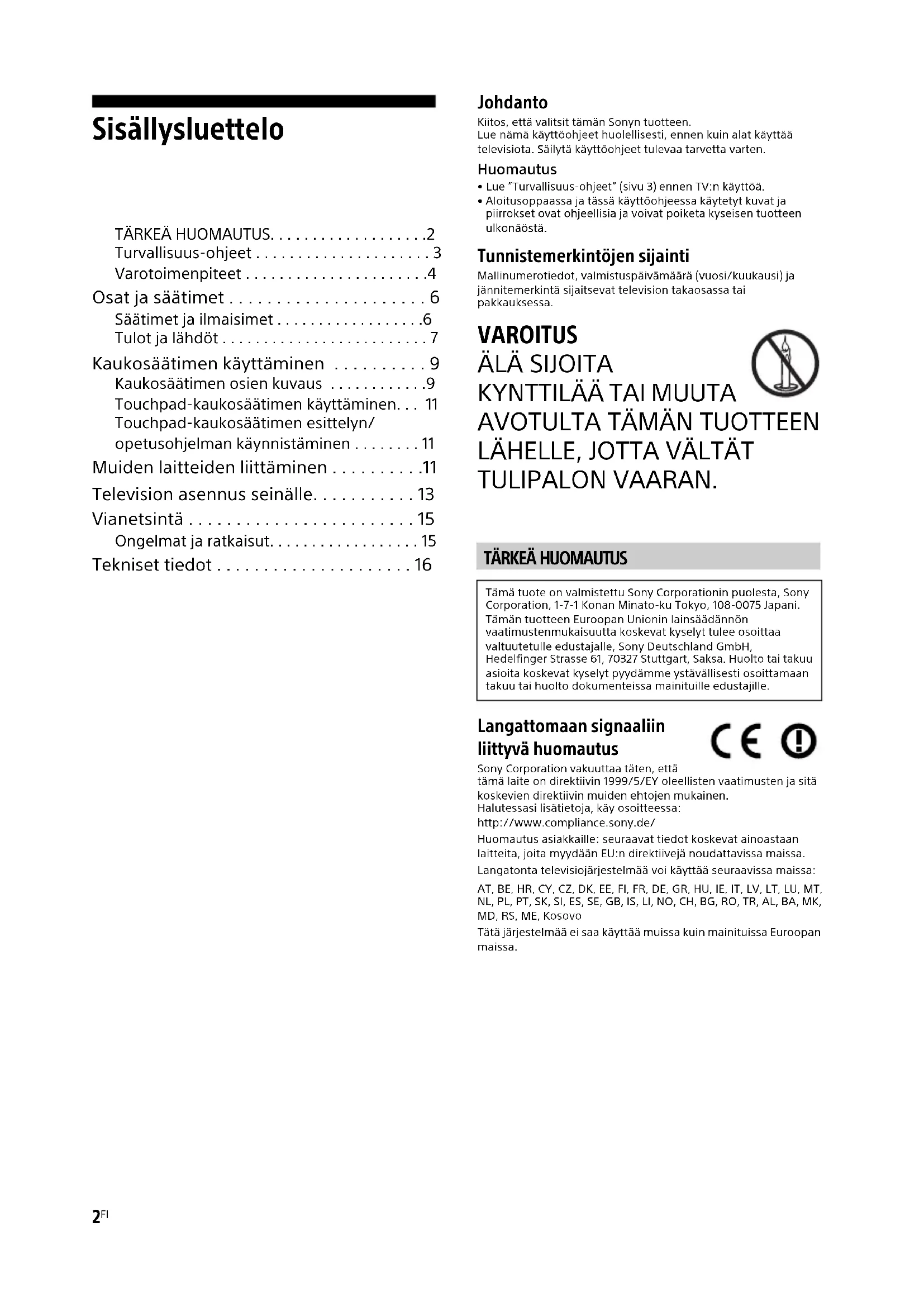 - Tekniset tiedot Johdanto Kiitos, että valitsit tämän Sonyn tuotteen. Lue nämä käyttöohjeet huolellisesti, ennen kuin alat käyttää televisiota. Säilytä käyttöohjeet tulevaa tarvetta varten.Huomautus p. 16