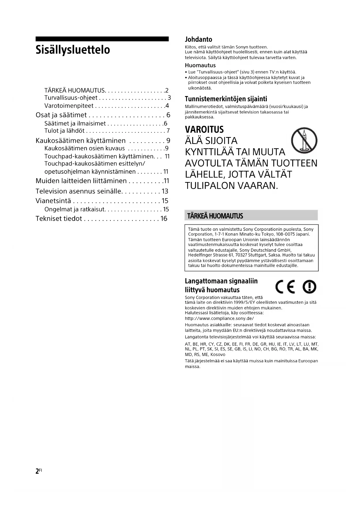 TULIPALON VAARAN. Langattomaan signaaliin liittyvä huomautus Sony Corporation vakuuttaa täten, että tämä laite on direktiivin 1999/5/EY oleellisten vaatimusten ja sitä koskevien direktiivin muiden ehtojen mukainen.Halutessasi lisätietoja, käy osoitteessa:http://www.compliance.sony.de/Huomautus asiakkaille: seuraavat tiedot koskevat ainoastaan laitteita, joita myydään EU:n direktiivejä noudattavissa maissa.Langatonta televisiojärjestelmää voi käyttää seuraavissa maissa: AT, BE, HR, CY, CZ, DK, EE, FI, FR, DE, GR, HU, IE, IT, LV, LT, LU, MT, NL, PL, PT, SK, SI, ES, SE, GB, IS, LI, NO, CH, BG, RO, TR, AL, BA, MK, MD, RS, ME, KosovoTätä järjestelmää ei saa käyttää muissa kuin mainituissa Euroopan maissa.