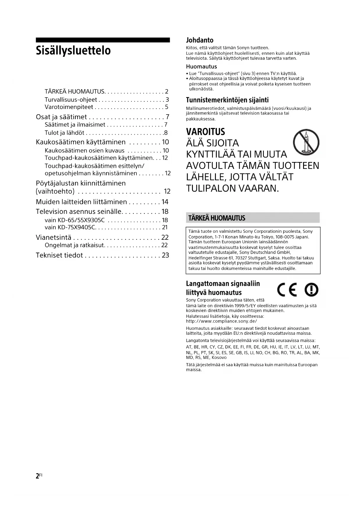 TULIPALON VAARAN. Langattomaan signaaliin liittyvä huomautus Sony Corporation vakuuttaa täten, että tämä laite on direktiivin 1999/5/EY oleellisten vaatimusten ja sitä koskevien direktiivin muiden ehtojen mukainen.Halutessasi lisätietoja, käy osoitteessa:http://www.compliance.sony.de/Huomautus asiakkaille: seuraavat tiedot koskevat ainoastaan laitteita, joita myydään EU:n direktiivejä noudattavissa maissa.Langatonta televisiojärjestelmää voi käyttää seuraavissa maissa: AT, BE, HR, CY, CZ, DK, EE, FI, FR, DE, GR, HU, IE, IT, LV, LT, LU, MT, NL, PL, PT, SK, SI, ES, SE, GB, IS, LI, NO, CH, BG, RO, TR, AL, BA, MK, MD, RS, ME, KosovoTätä järjestelmää ei saa käyttää muissa kuin mainituissa Euroopan maissa.