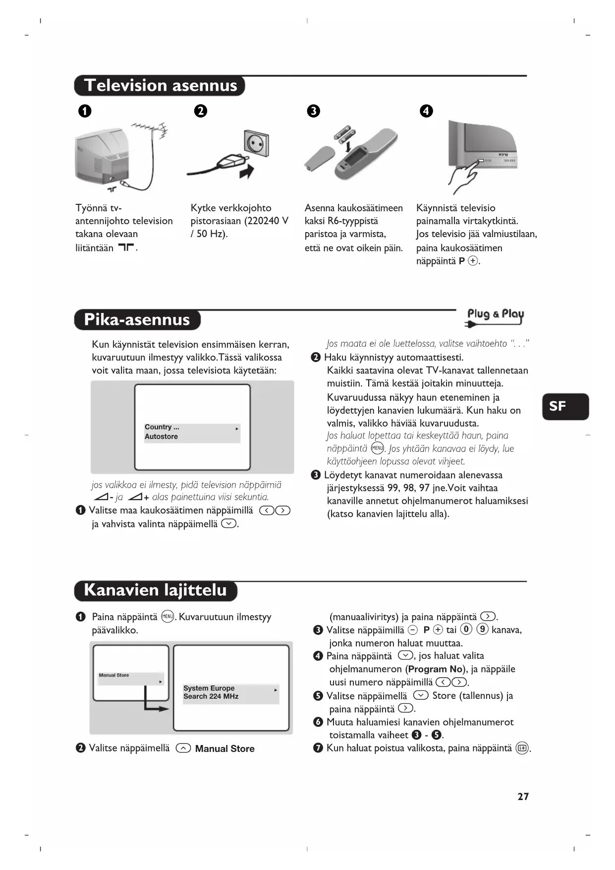 Kytke verkkojohto pistorasiaan (220240 V / 50 Hz). Asenna kaukosäätimeen kaksi R6-tyyppistä paristoa ja varmista, että ne ovat oikein päin. Käynnistä televisio painamalla virtakytkintä. Jos televisio jää valmiustilaan, paina kaukosäätimen näppäintä P #. æÂê® Pika-asennus Kanavien lajittelu Kun käynnistät television ensimmäisen kerran, kuvaruutuun ilmestyy valikko.Tässä valikossa voit valita maan, jossa televisiota käytetään: jos valikkoa ei ilmesty, pidä television näppäimiä ”- ja ”+ alas painettuina viisi sekuntia. & Valitse maa kaukosäätimen näppäimillä
