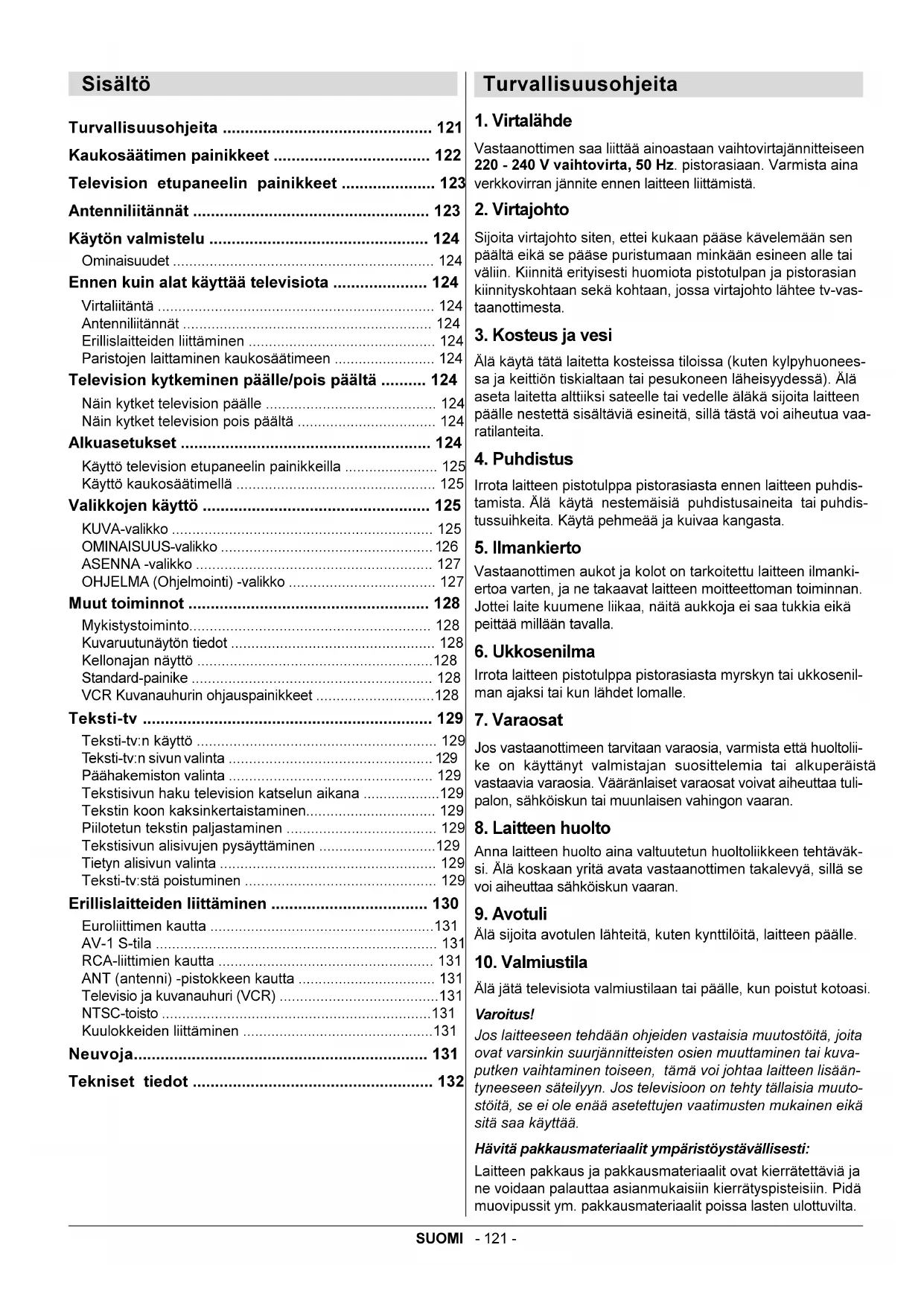 - Älä jätä televisiota valmiustilaan tai päälle, kun poistut kotoasi. Varoitus! Jos laitteeseen tehdään ohjeiden vastaisia muutostöitä, joita ovat varsinkin suurjännitteisten osien muuttaminen tai kuva- putken vaihtaminen toiseen, tämä voi johtaa laitteen lisään- tyneeseen säteilyyn. Jos televisioon on tehty tällaisia muuto- stöitä, se ei ole enää asetettujen vaatimusten mukainen eikä sitä saa käyttää. Hävitä pakkausmateriaalit ympäristöystävällisesti: Laitteen pakkaus ja pakkausmateriaalit ovat kierrätettäviä ja ne voidaan palauttaa asianmukaisiin kierrätyspisteisiin. Pidä muovipussit ym. pakkausmateriaalit poissa lasten ulottuvilta. Sisältö Turvallisuusohjeita p. 121