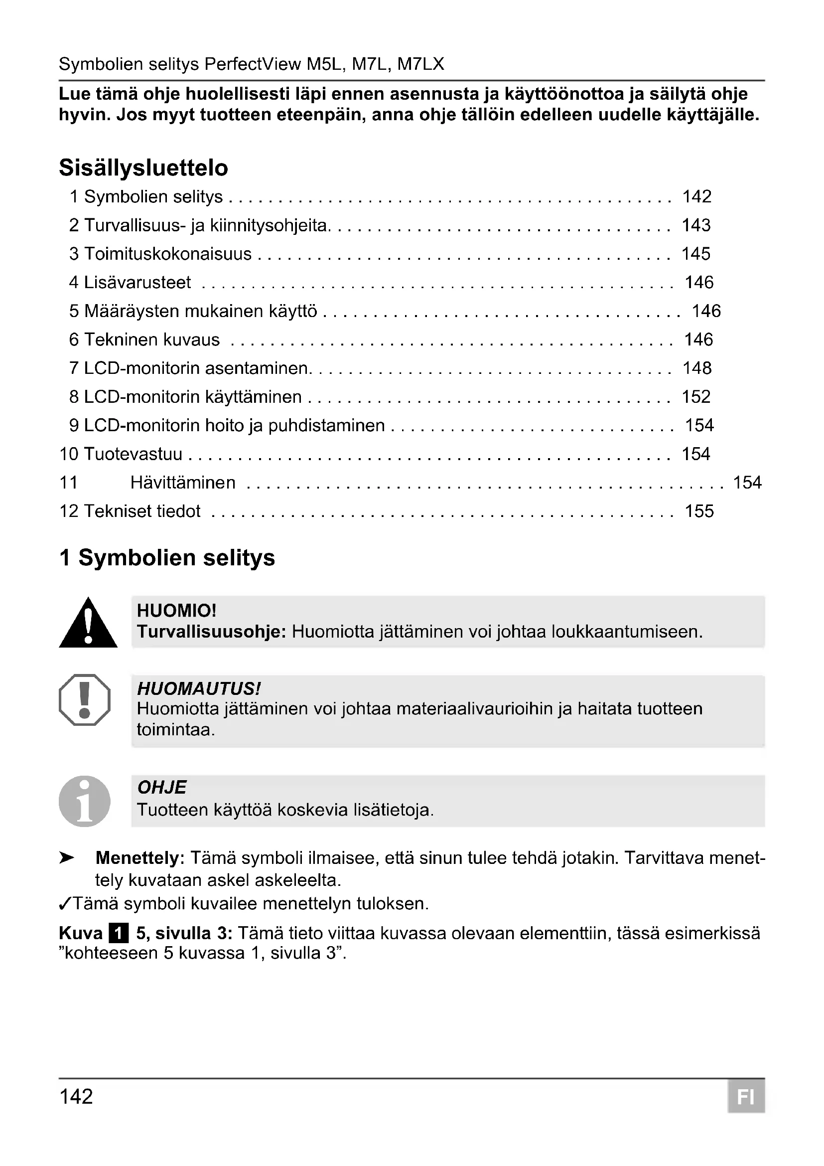 ➤ Menettely: Tämä symboli ilmaisee, että sinun tulee tehdä jotakin. Tarvittava menet- tely kuvataan askel askeleelta. ✓ Tämä symboli kuvailee menettelyn tuloksen. Kuva 1 5, sivulla 3: Tämä tieto viittaa kuvassa olevaan elementtiin, tässä esimerkissä ”kohteeseen 5 kuvassa 1, sivulla 3”. HUOMIO! Turvallisuusohje: Huomiotta jättäminen voi johtaa loukkaantumiseen. HUOMAUTUS! Huomiotta jättäminen voi johtaa materiaalivaurioihin ja haitata tuotteen toimintaa. OHJE Tuotteen käyttöä koskevia lisätietoja.PerfectView M5L, M7L, M7LX Turvallisuus- ja kiinnitysohjeita
