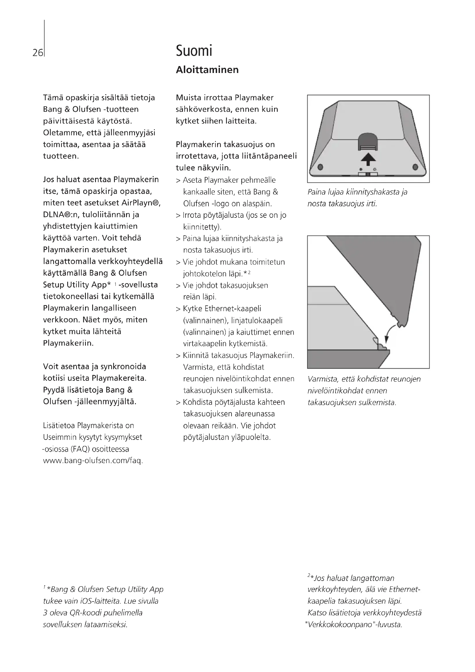 Med förbehåll för ändringar av tekniska specikationer, funktioner och deras användning.Suomi Tämä opaskirja sisältää tietoja Bang& Olufsen -tuotteen päivittäisestä käytöstä. Oletamme, että jälleenmyyjäsi toimittaa, asentaa ja säätää tuotteen. Jos haluat asentaa Playmakerin itse, tämä opaskirja opastaa, miten teet asetukset AirPlayn®, DLNA®:n, tuloliitännän ja yhdistettyjen kaiuttimien käyttöä varten. Voit tehdä Playmakerin asetukset langattomalla verkkoyhteydellä käyttämällä Bang& Olufsen Setup Utility App*
