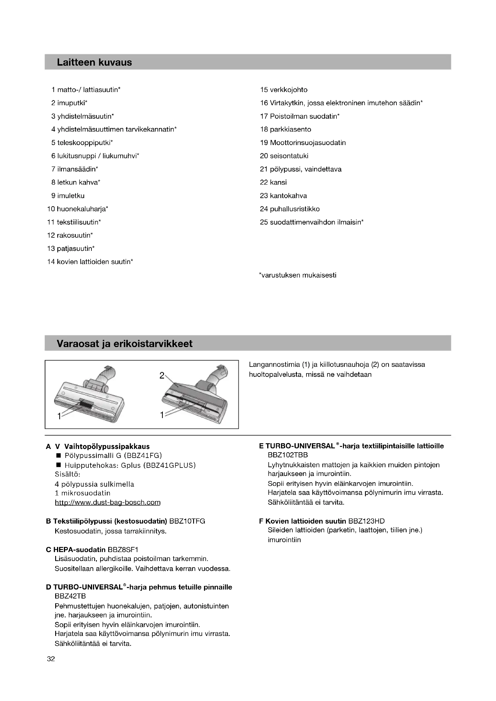 sv32 Laitteen kuvaus 1 matto-/ lattiasuutin* 2 imuputki* 3 yhdistelmäsuutin* 4 yhdistelmäsuuttimen tarvikekannatin* 5 teleskooppiputki* 6 lukitusnuppi / liukumuhvi* 7 ilmansäädin* 8 letkun kahva* 9 imuletku 10 huonekaluharja* 11 tekstiilisuutin* 12 rakosuutin* 13 patjasuutin* 14 kovien lattioiden suutin* 15 verkkojohto 16 Virtakytkin, jossa elektroninen imutehon säädin* 17 Poistoilman suodatin* 18 parkkiasento 19 Moottorinsuojasuodatin 20 seisontatuki 21 pölypussi, vaindettava 22 kansi 23 kantokahva 24 puhallusristikko 25 suodattimenvaihdon ilmaisin* *varustuksen mukaisesti Varaosat ja erikoistarvikkeet Langannostimia (1) ja kiillotusnauhoja (2) on saatavissa huoltopalvelusta, missä ne vaihdetaan