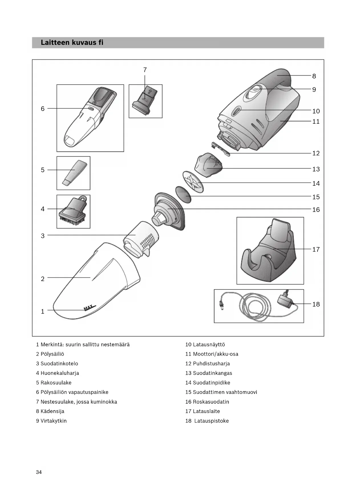 Älä käytä hankausaineita, lasin- tai yleispuhdistusaineita. Älä koskaan upota imuria veteen Akkujen hävittäminen Irrota akkulohko ennen käytetyn laitteen hävittämistä ja hävitä se erikseen. Kuva Työnnä akkukotelo auki nuolen suuntaan. Katkaise kiinnityshihna ja ota akkulohko pois paikaltaan. Katkaise liitäntäjohto ja eristä johdon päät varmuuden vuoksi yksittäin eristysnauhalla. *varusteista riippuen 14* fi38 Descripción del aparato es 1 Marca del nivel máximo de líquido 2 Depósito de suciedad 3 Portafiltros 4 Cepillo para muebles 5 Boquilla para juntas 6 Tecla de desenclavamiento del depósito de suciedad 7 Boquilla para líquido con falda de goma 8 Empuñadura 9 Tecla de conexión y desconexión MAX. 10 Indicador de funcionamiento con carga 11 Unidad de aspiración 12 Cepillo de limpieza 13 Fieltro del filtro 14 Soporte del filtro 15 Espuma filtrante 16 Filtro de suciedad 17 Estación de carga 18 Enchufe de carga
