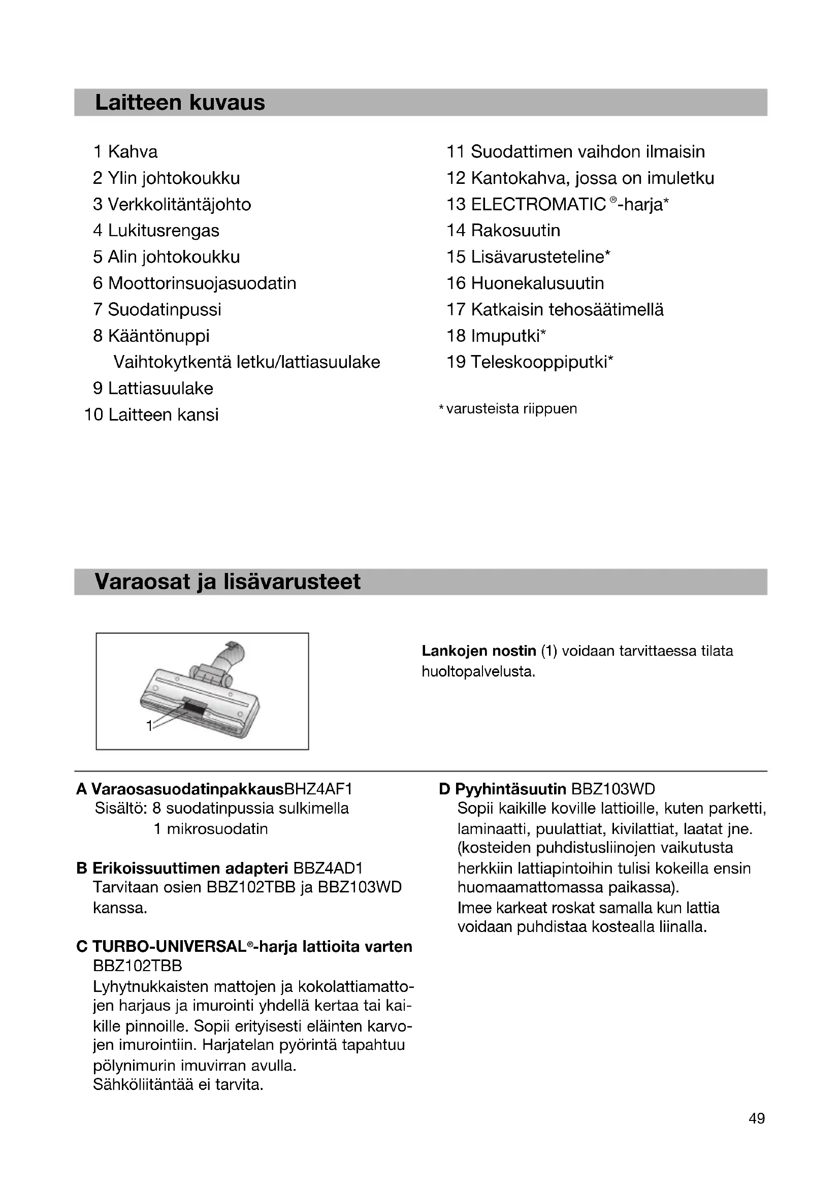 -harja lattioita varten BBZ102TBB Lyhytnukkaisten mattojen ja kokolattiamatto- jen harjaus ja imurointi yhdellä kertaa tai kai- kille pinnoille. Sopii erityisesti eläinten karvo- jen imurointiin. Harjatelan pyörintä tapahtuu pölynimurin imuvirran avulla. Sähköliitäntää ei tarvita. Lankojen nostin (1) voidaan tarvittaessa tilata huoltopalvelusta. D Pyyhintäsuutin BBZ103WD Sopii kaikille koville lattioille, kuten parketti, laminaatti, puulattiat, kivilattiat, laatat jne. (kosteiden puhdistusliinojen vaikutusta herkkiin lattiapintoihin tulisi kokeilla ensin huomaamattomassa paikassa). Imee karkeat roskat samalla kun lattia voidaan puhdistaa kostealla liinalla.