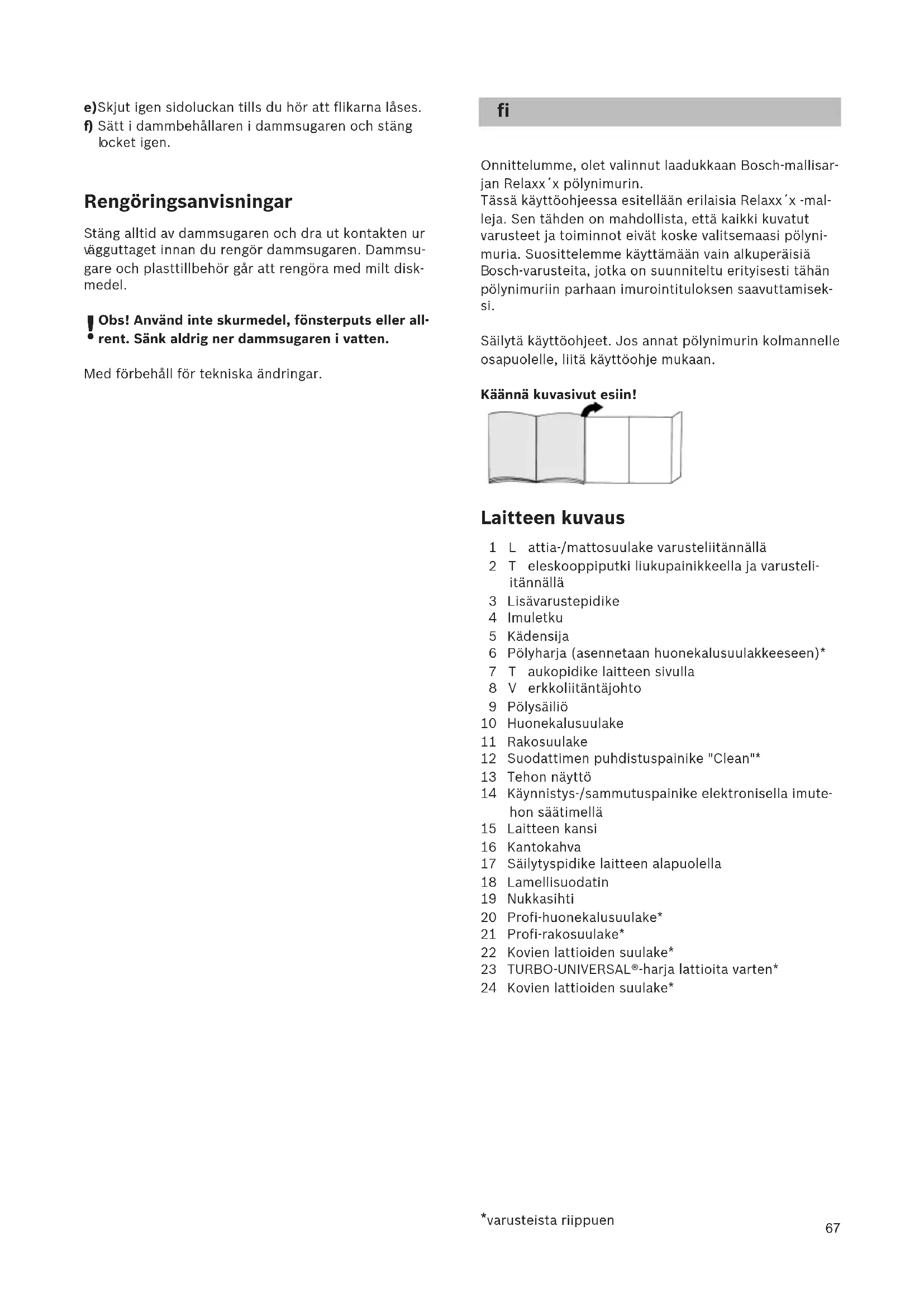 ölynimuriin parhaan imurointituloksen saavuttamisek- si. Säilytä käyttöohjeet. Jos annat pölynimurin kolmannelle osapuolelle, liitä käyttöohje mukaan. Käännä kuvasivut esiin! Laitteen kuvaus 1Lattia-/mattosuulake varusteliitännällä 2Teleskooppiputki liukupainikkeella ja varusteli- itännällä 3 Lisävarustepidike 4 Imuletku 5 Kädensija 6 Pölyharja (asennetaan huonekalusuulakkeeseen)* 7Taukopidike laitteen sivulla 8Verkkoliitäntäjohto 9 Pölysäiliö 10 Huonekalusuulake 11 Rakosuulake 12 Suodattimen puhdistuspainike "Clean"* 13 Tehon näyttö 14 Käynnistys-/sammutuspainike elektronisella imute- hon säätimellä 15 Laitteen kansi 16 Kantokahva 17 Säilytyspidike laitteen alapuolella 18 Lamellisuodatin 19 Nukkasihti 20 Profi-huonekalusuulake* 21 Profi-rakosuulake* 22 Kovien lattioiden suulake* 23 TURBO-UNIVERSAL®-harja lattioita varten* 24 Kovien lattioiden suulake* *varusteista riippuen fi68 Varaosat ja lisävarusteet