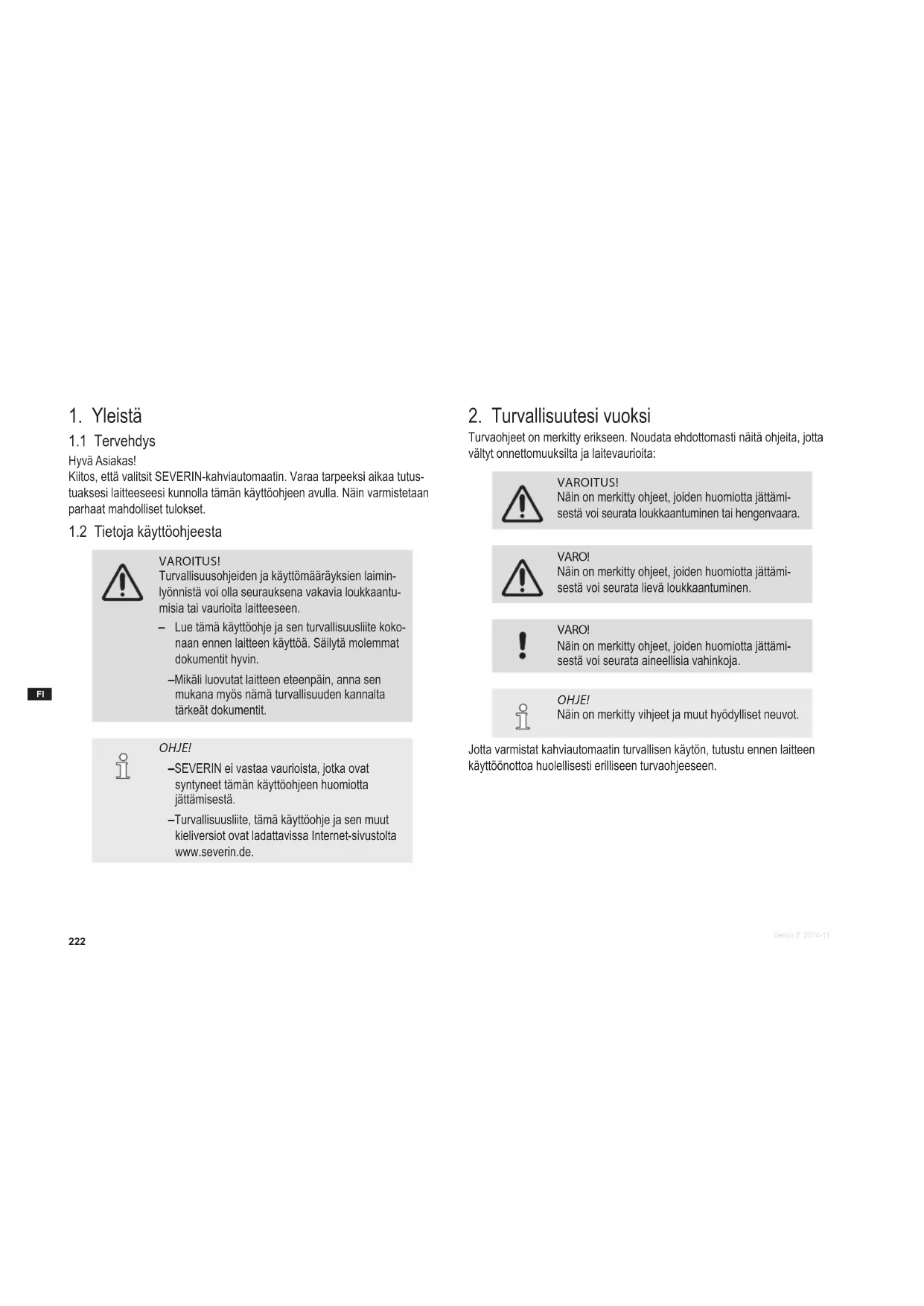 VAROITUS! Turvallisuusohjeiden ja käyttömääräyksien laimin- lyönnistä voi olla seurauksena vakavia loukkaantu- misia tai vaurioita laitteeseen. – Lue tämä käyttöohje ja sen turvallisuusliite koko- naan ennen laitteen käyttöä. Säilytä molemmat dokumentit hyvin. – Mikäli luovutat laitteen eteenpäin, anna sen mukana myös nämä turvallisuuden kannalta tärkeät dokumentit. OHJE! – SEVERIN ei vastaa vaurioista, jotka ovat syntyneet tämän käyttöohjeen huomiotta jättämisestä. – Turvallisuusliite, tämä käyttöohje ja sen muut kieliversiot ovat ladattavissa Internet-sivustolta www.severin.de.