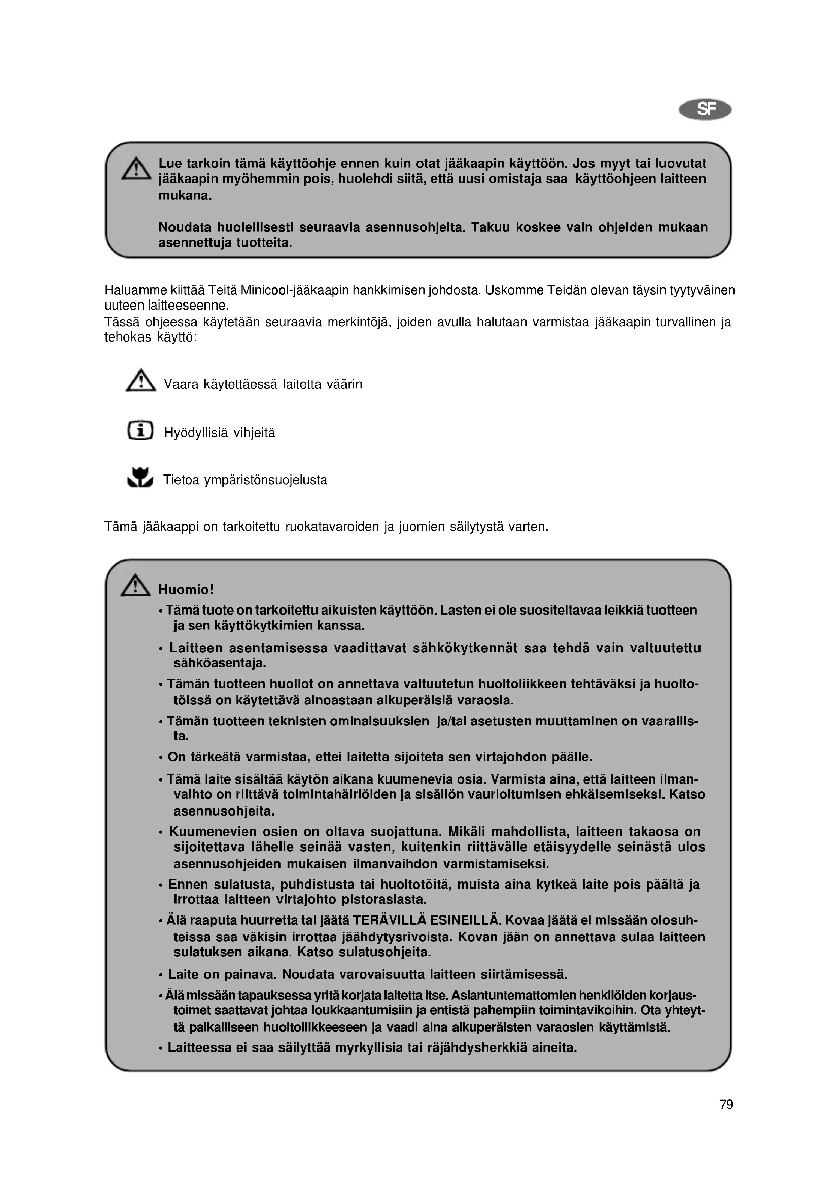 Lue tarkoin tämä käyttöohje ennen kuin otat jääkaapin käyttöön. Jos myyt tai luovutat jääkaapin myöhemmin pois, huolehdi siitä, että uusi omistaja saa käyttöohjeen laitteen mukana. Noudata huolellisesti seuraavia asennusohjeita. Takuu koskee vain ohjeiden mukaan asennettuja tuotteita. Haluamme kiittää Teitä Minicool-jääkaapin hankkimisen johdosta. Uskomme Teidän olevan täysin tyytyväinen uuteen laitteeseenne. Tässä ohjeessa käytetään seuraavia merkintöjä, joiden avulla halutaan varmistaa jääkaapin turvallinen ja tehokas käyttö: Vaara käytettäessä laitetta väärin Hyödyllisiä vihjeitä Tietoa ympäristönsuojelusta Tämä jääkaappi on tarkoitettu ruokatavaroiden ja juomien säilytystä varten. Huomio!