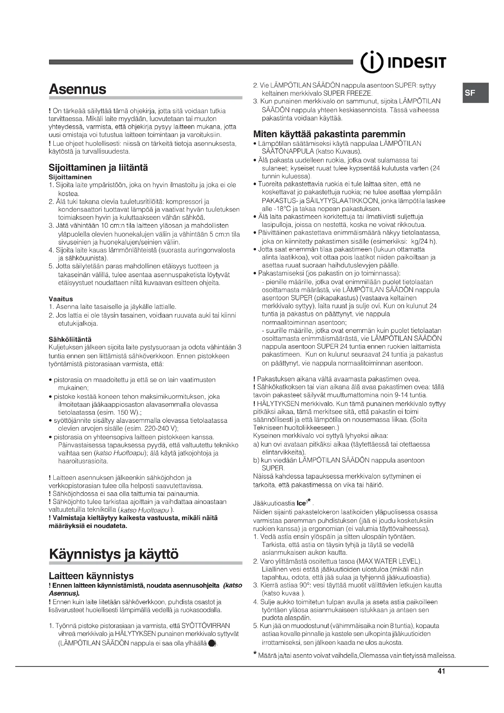 ! Valmistaja kieltäytyy kaikesta vastuusta, mikäli näitämääräyksiä ei noudateta. Käynnistys ja käyttö Laitteen käynnistys ! Ennen laitteen käynnistämistä, noudata asennusohjeita (katso Asennus). ! Ennen kuin laite liitetään sähköverkkoon, puhdista osastot jalisävarusteet huolellisesti lämpimällä vedellä ja ruokasoodalla.1. Työnnä pistoke pistorasiaan ja varmista, että SYÖTTÖVIRRANvihreä merkkivalo ja HÄLYTYKSEN punainen merkkivalo syttyvät(LÄMPÖTILAN SÄÄDÖN nappula ei saa olla ylhäällä 2. Vie LÄMPÖTILAN SÄÄDÖN nappula asentoon SUPER: syttyykeltainen merkkivalo SUPER FREEZE.3. Kun punainen merkkivalo on sammunut, sijoita LÄMPÖTILANSÄÄDÖN nappula yhteen keskiasennoista. Tässä vaiheessapakastinta voidaan käyttää. Miten käyttää pakastinta paremmin
