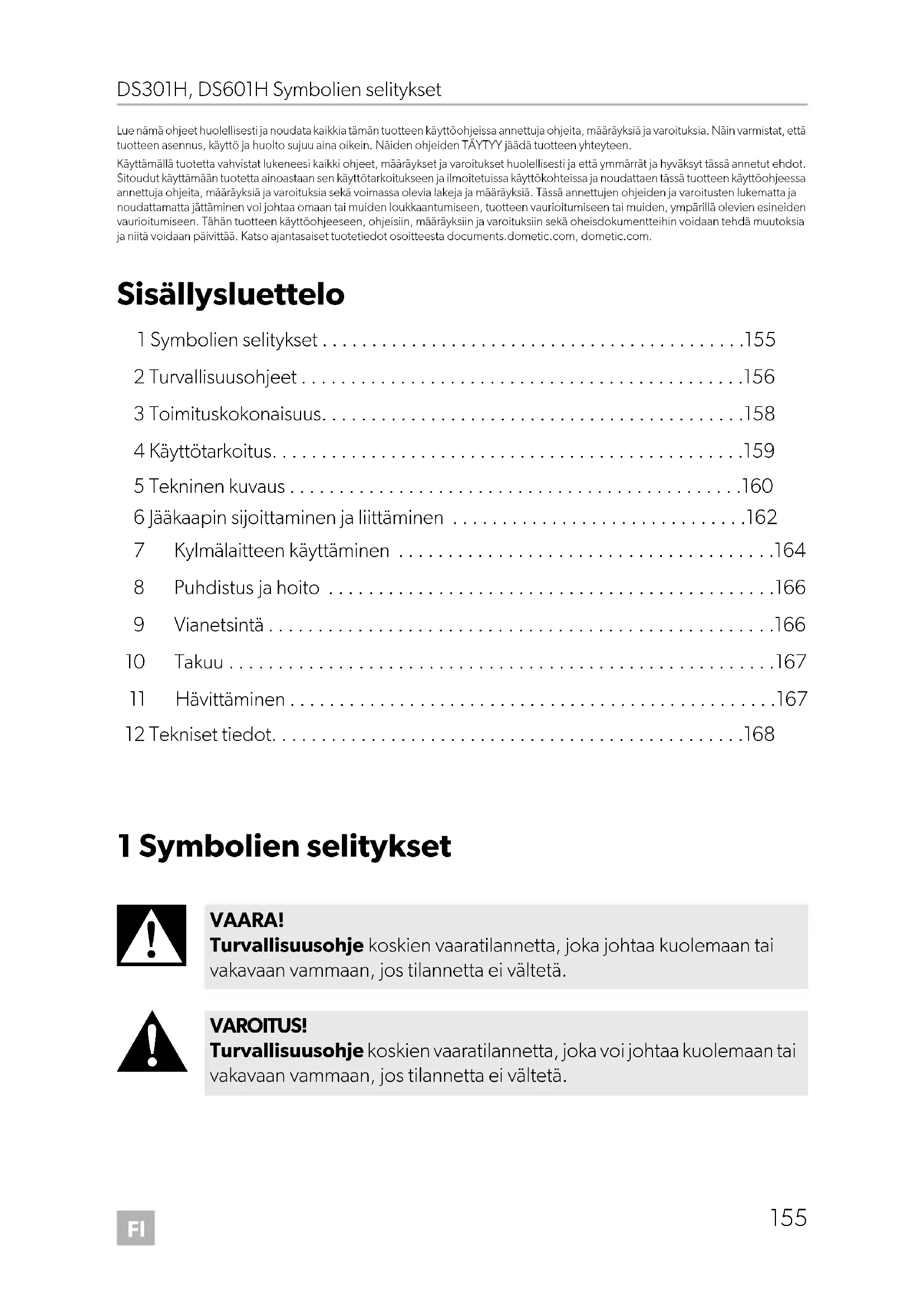VAARA! Turvallisuusohje koskien vaaratilannetta, joka johtaa kuolemaan tai vakavaan vammaan, jos tilannetta ei vältetä. VAROITUS! Turvallisuusohje koskien vaaratilannetta, joka voi johtaa kuolemaan tai vakavaan vammaan, jos tilannetta ei vältetä. DometicDS301-601H_IOM_4445103317_EMEA16_20xx-xx-xx.book Seite 155 Montag, 22. Februar 2021 6:18 18FI Turvallisuusohjeet DS301H, DS601H