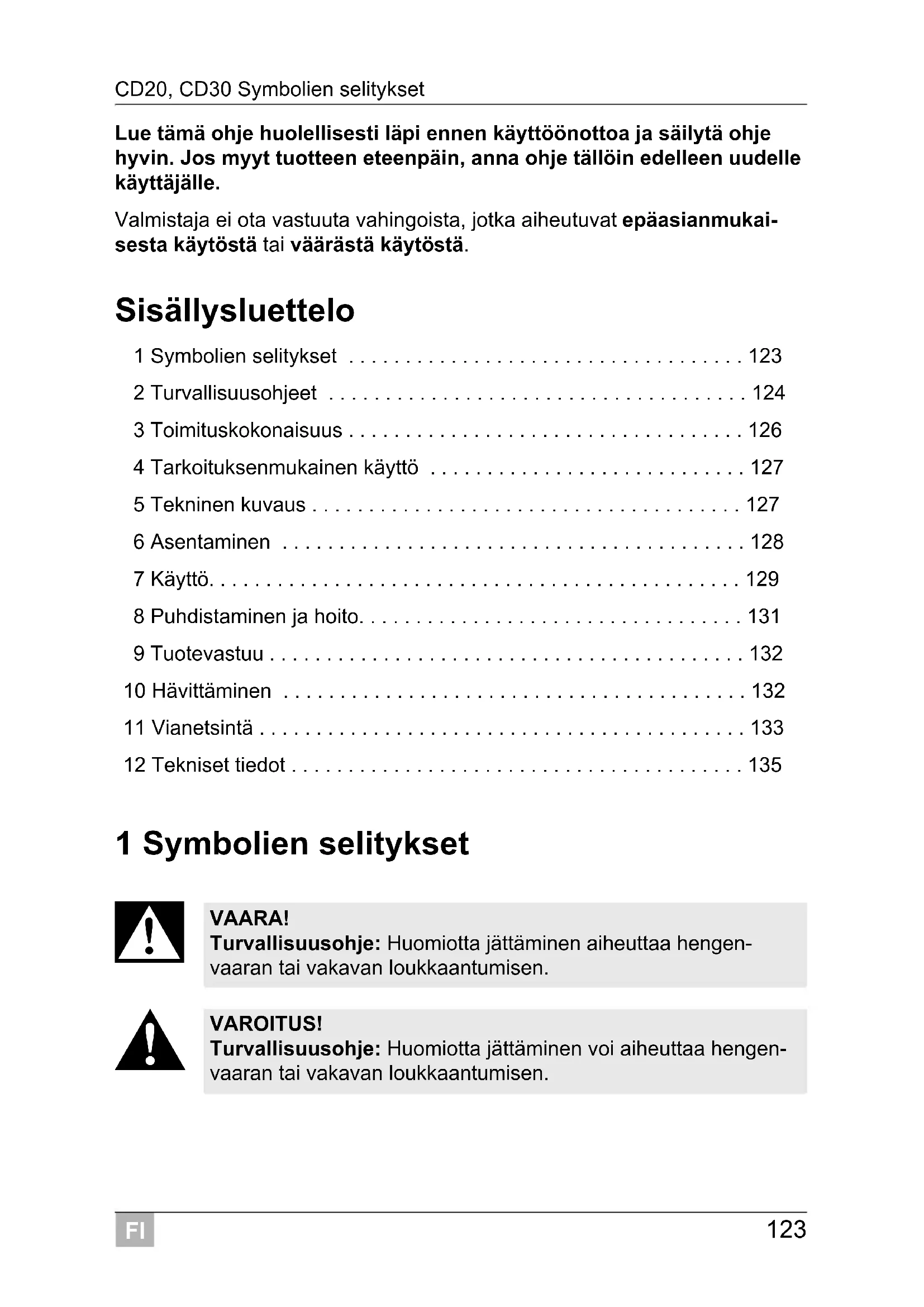 VAARA! Turvallisuusohje: Huomiotta jättäminen aiheuttaa hengen- vaaran tai vakavan loukkaantumisen. VAROITUS! Turvallisuusohje: Huomiotta jättäminen voi aiheuttaa hengen- vaaran tai vakavan loukkaantumisen.FI Turvallisuusohjeet CD20, CD30