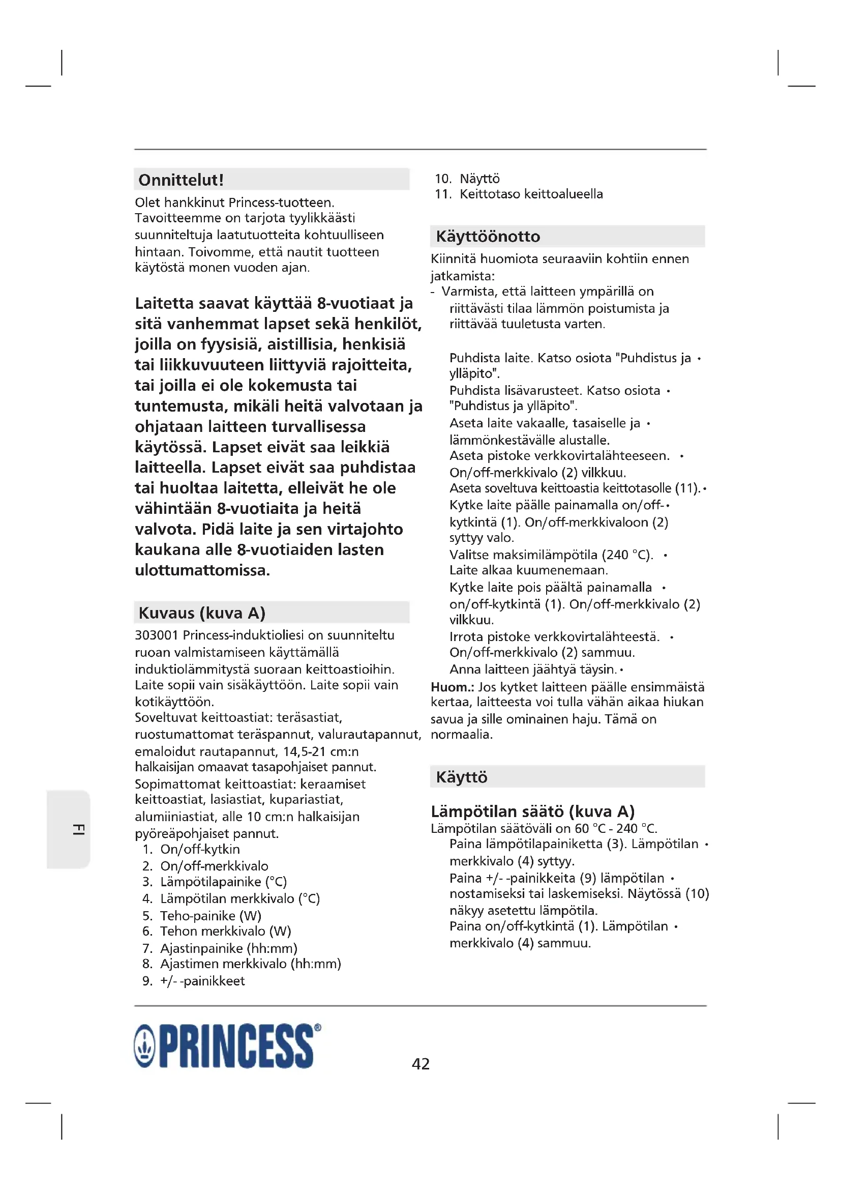 Onnittelut! Olet hankkinut Princess-tuotteen. Tavoitteemme on tarjota tyylikkäästi suunniteltuja laatutuotteita kohtuulliseen hintaan. Toivomme, että nautit tuotteen käytöstä monen vuoden ajan. Laitetta saavat käyttää 8-vuotiaat ja sitä vanhemmat lapset sekä henkilöt, joilla on fyysisiä, aistillisia, henkisiä tai liikkuvuuteen liittyviä rajoitteita, tai joilla ei ole kokemusta tai tuntemusta, mikäli heitä valvotaan ja ohjataan laitteen turvallisessa käytössä. Lapset eivät saa leikkiä laitteella. Lapset eivät saa puhdistaa tai huoltaa laitetta, elleivät he ole vähintään 8-vuotiaita ja heitä valvota. Pidä laite ja sen virtajohto kaukana alle 8-vuotiaiden lasten ulottumattomissa. Kuvaus (kuva A) 303001 Princess-induktioliesi on suunniteltu ruoan valmistamiseen käyttämällä induktiolämmitystä suoraan keittoastioihin. Laite sopii vain sisäkäyttöön. Laite sopii vain kotikäyttöön. Soveltuvat keittoastiat: teräsastiat, ruostumattomat teräspannut, valurautapannut, emaloidut rautapannut, 14,5-21 cm:n halkaisijan omaavat tasapohjaiset pannut. Sopimattomat keittoastiat: keraamiset keittoastiat, lasiastiat, kupariastiat, alumiiniastiat, alle 10 cm:n halkaisijan pyöreäpohjaiset pannut.