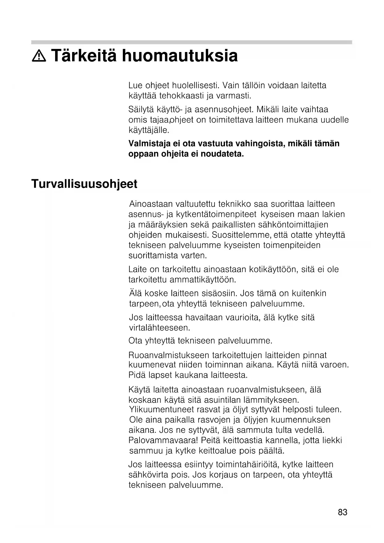90m Lue ohjeet huolellisesti. Vain tällöin voidaan laitetta käyttää tehokkaasti ja varmasti. Tärkeitä huomautuksia ohjeet on toimitettavalaitteen omis tajaa, mukana uudelle käyttäjälle. Valmistaja ei ota vastuuta vahingoista, mikäli tämän Säilytä käyttö- ja asennusohjeet. Mikäli laite vaihtaa oppaan ohjeita ei noudateta. Turvallisuusohjeet mukaisesti. Suosittelemme,Ainoastaan valtuutettu teknikko saa suorittaa laitteen asennus- ja kytkentätoimenpiteet kyseisen maan lakien ja määräyksien sekä paikallisten sähköntoimittajien ohjeiden että otatte yhteyttä tekniseen palveluumme kyseisten toimenpiteiden suorittamista varten. Laite on tarkoitettu ainoastaan kotikäyttöön, sitä ei ole tarkoitettu ammattikäyttöön. palveluumme. ota yhteyttä tekniseenÄlä koske laitteen sisäosiin. Jos tämä on kuitenkin tarpeen,Jos laitteessa havaitaan vaurioita, älä kytke sitä virtalähteeseen. Ota yhteyttä tekniseen palveluumme. aikana. Käytä niitä varoen. Pidä lapset kaukana laitteesta. Ruoanvalmistukseen tarkoitettujen laitteiden pinnat kuumenevat niiden toiminnan lämmitykseen. pois päältä. Käytä laitetta ainoastaan ruoanvalmistukseen, älä koskaan käytä sitä asuintilan Ylikuumentuneet rasvat ja öljyt syttyvät helposti tuleen. Ole aina paikalla rasvojen ja öljyjen kuumennuksen aikana. Jos ne syttyvät, älä sammuta tulta vedellä. Palovammavaara! Peitä keittoastia kannella, jotta liekki sammuu ja kytke keittoalue Jos laitteessa esiintyy toimintahäiriöitä, kytke laitteen sähkövirta pois. Jos korjaus on tarpeen, ota yhteyttä tekniseen palveluumme. 83Älä käytä höyryllä toimivia puhdistuslaitteita laitteen puhdistukseen. Sähköiskuvaara! Tämän käyttöoppaan kuvat ovat viitteellisiä. Sähkötoimiset keittotasot Ennen käyttöönottoa Uuden laitteen hajun voi poistaa kytkemällä keittoalueet päälle yksi kerrallaan ja ilman keittoastiaa, maksimitehoa käyttäen viiden minuutin ajaksi. Älä kytke useampaa keittoaluetta päälle samanaikaisesti, vaan ainoastaan yksi kerrallaan. Kuumennuksen aikana on normaalia, että keittoalueista tulee savua ja hajuja, ja ne poistuvat ajan kanssa.