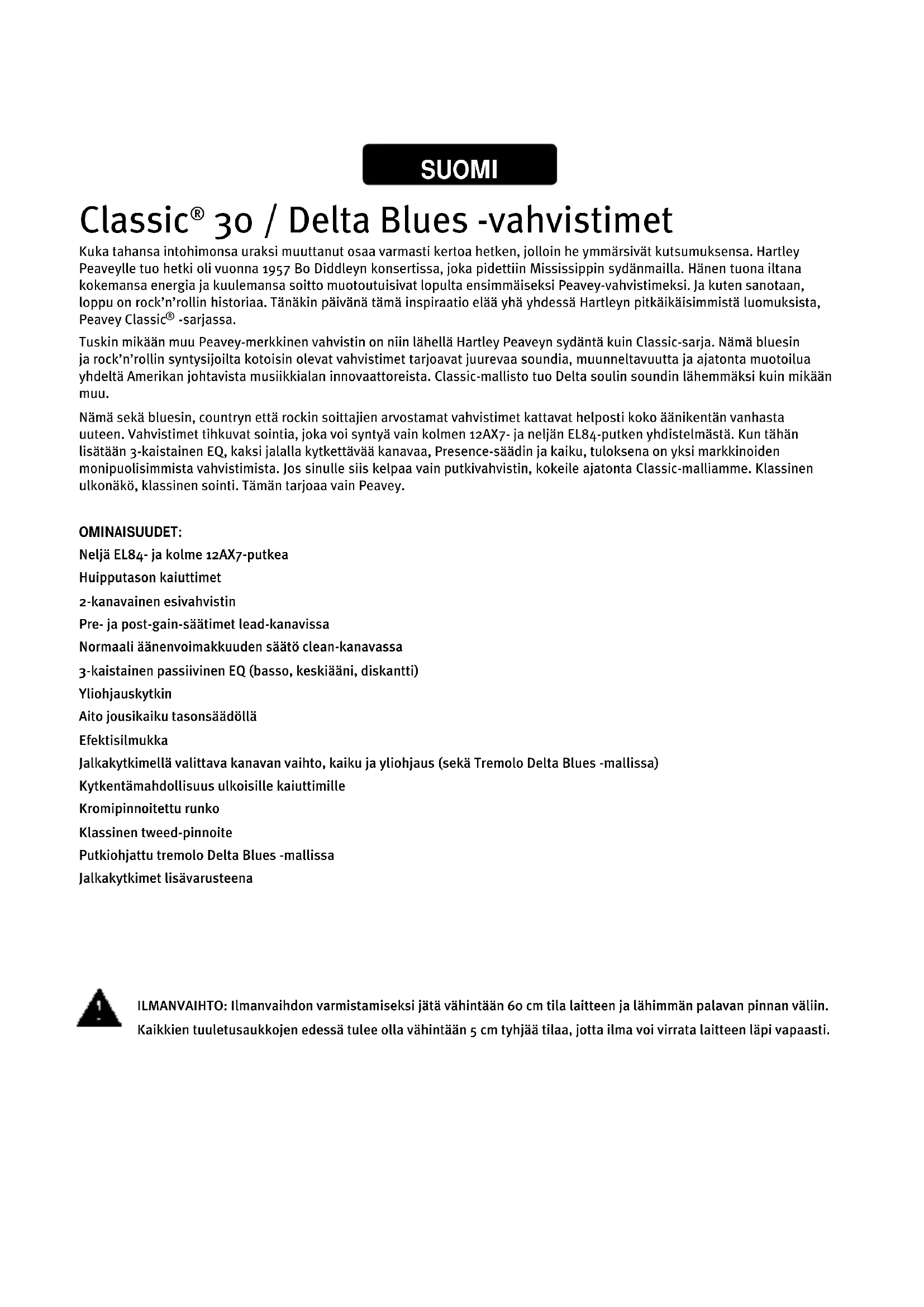 -sarjassa. Tuskin mikään muu Peavey-merkkinen vahvistin on niin lähellä Hartley Peaveyn sydäntä kuin Classic-sarja. Nämä bluesin ja rock’n’rollin syntysijoilta kotoisin olevat vahvistimet tarjoavat juurevaa soundia, muunneltavuutta ja ajatonta muotoilua yhdeltä Amerikan johtavista musiikkialan innovaattoreista. Classic-mallisto tuo Delta soulin soundin lähemmäksi kuin mikään muu. Nämä sekä bluesin, countryn että rockin soittajien arvostamat vahvistimet kattavat helposti koko äänikentän vanhasta uuteen. Vahvistimet tihkuvat sointia, joka voi syntyä vain kolmen 12AX7- ja neljän EL84-putken yhdistelmästä. Kun tähän lisätään 3-kaistainen EQ, kaksi jalalla kytkettävää kanavaa, Presence-säädin ja kaiku, tuloksena on yksi markkinoiden monipuolisimmista vahvistimista. Jos sinulle siis kelpaa vain putkivahvistin, kokeile ajatonta Classic-malliamme. Klassinen ulkonäkö, klassinen sointi. Tämän tarjoaa vain Peavey. OMINAISUUDET: Neljä EL84- ja kolme 12AX7-putkea Huipputason kaiuttimet 2-kanavainen esivahvistin Pre- ja post-gain-säätimet lead-kanavissa Normaali äänenvoimakkuuden säätö clean-kanavassa 3-kaistainen passiivinen EQ (basso, keskiääni, diskantti) Yliohjauskytkin Aito jousikaiku tasonsäädöllä Efektisilmukka Jalkakytkimellä valittava kanavan vaihto, kaiku ja yliohjaus (sekä Tremolo Delta Blues -mallissa) Kytkentämahdollisuus ulkoisille kaiuttimille Kromipinnoitettu runko Klassinen tweed-pinnoite Putkiohjattu tremolo Delta Blues -mallissa Jalkakytkimet lisävarusteena SUOMI ILMANVAIHTO: Ilmanvaihdon varmistamiseksi jätä vähintään 60 cm tila laitteen ja lähimmän palavan pinnan väliin. Kaikkien tuuletusaukkojen edessä tulee olla vähintään 5 cm tyhjää tilaa, jotta ilma voi virrata laitteen läpi vapaasti.Classic