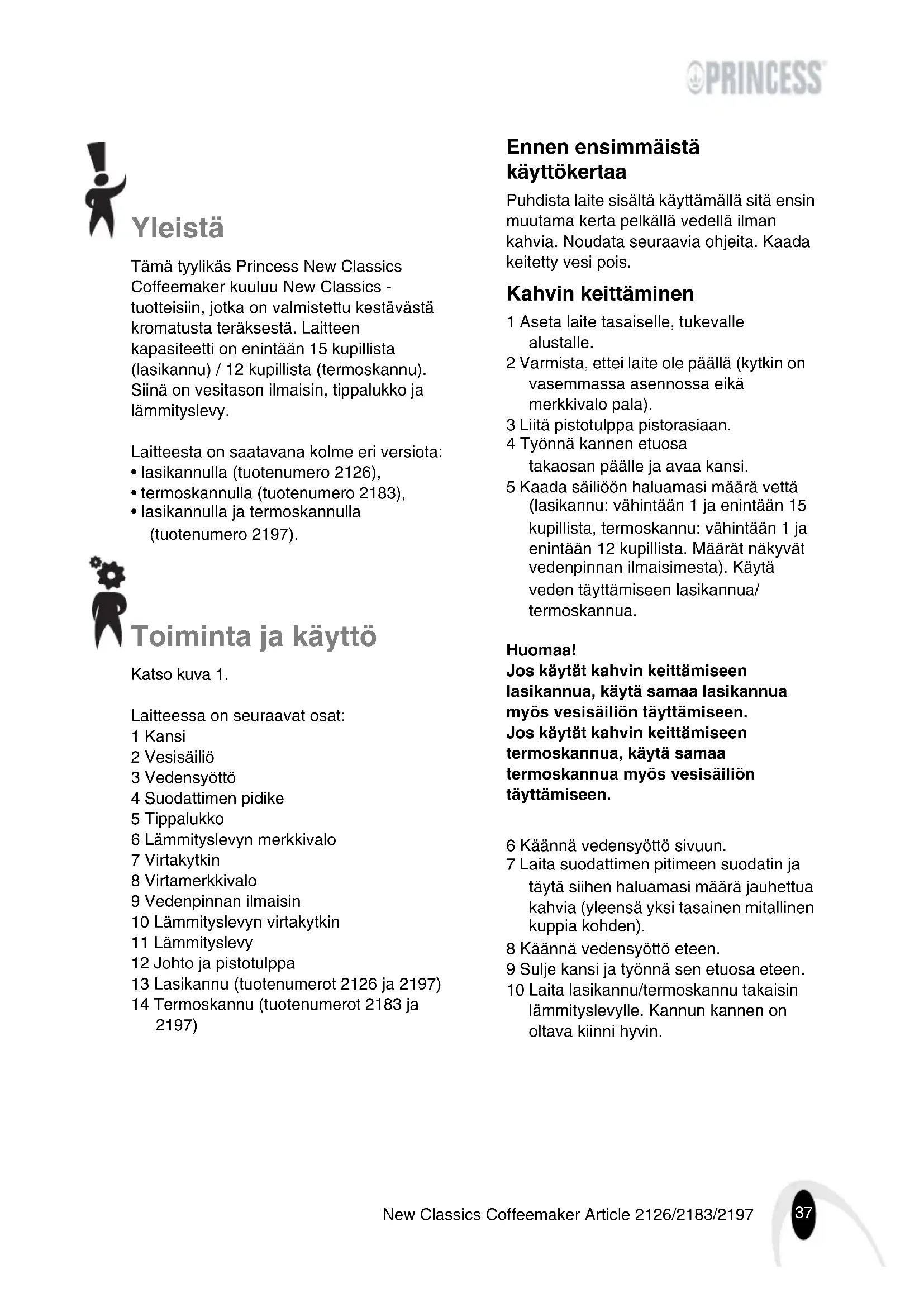 - lasikannulla ja termoskannulla (tuotenumero 2197). Toiminta ja käyttö Katso kuva 1. Laitteessa on seuraavat osat: 1 Kansi 2 Vesisäiliö 3 Vedensyöttö 4 Suodattimen pidike 5 Tippalukko 6 Lämmityslevyn merkkivalo 7 Virtakytkin 8 Virtamerkkivalo 9 Vedenpinnan ilmaisin 10 Lämmityslevyn virtakytkin 11 Lämmityslevy 12 Johto ja pistotulppa 13 Lasikannu (tuotenumerot 2126 ja 2197) 14 Termoskannu (tuotenumerot 2183 ja 2197) Ennen ensimmäistä käyttökertaa Puhdista laite sisältä käyttämällä sitä ensin muutama kerta pelkällä vedellä ilman kahvia. Noudata seuraavia ohjeita. Kaada keitetty vesi pois. Kahvin keittäminen 1 Aseta laite tasaiselle, tukevalle alustalle. 2 Varmista, ettei laite ole päällä (kytkin on vasemmassa asennossa eikä merkkivalo pala). 3 Liitä pistotulppa pistorasiaan. 4 Työnnä kannen etuosa takaosan päälle ja avaa kansi. 5 Kaada säiliöön haluamasi määrä vettä (lasikannu: vähintään 1 ja enintään 15 kupillista, termoskannu: vähintään 1 ja enintään 12 kupillista. Määrät näkyvät vedenpinnan ilmaisimesta). Käytä veden täyttämiseen lasikannua/ termoskannua. Huomaa! Jos käytät kahvin keittämiseen lasikannua, käytä samaa lasikannua myös vesisäiliön täyttämiseen. Jos käytät kahvin keittämiseen termoskannua, käytä samaa termoskannua myös vesisäiliön täyttämiseen. 6 Käännä vedensyöttö sivuun. 7 Laita suodattimen pitimeen suodatin ja täytä siihen haluamasi määrä jauhettua kahvia (yleensä yksi tasainen mitallinen kuppia kohden). 8 Käännä vedensyöttö eteen. 9 Sulje kansi ja työnnä sen etuosa eteen. 10 Laita lasikannu/termoskannu takaisin lämmityslevylle. Kannun kannen on oltava kiinni hyvin.38 New Classics Coffeemaker Article 2126/2183/2197 Huomaa! Termoskannu: laita kannun alaosan jalat levyn reikiin. Lasikannu: laita kannu tasaisesti lämmityslevylle. 11 Käynnistä uudelleen (käännä kytkin oikealle). Virtamerkkivalo ja lämmityslevyn merkkivalo syttyvät. Laite keittää kahvin. Lämmityslevy pitää kahvin lämpimänä. Huomautus: Termoskannua käytettäessä lämmityslevy sammuu heti, kun kahvi on valmista. Tällöin lämmityslevyn merkkivalo sammuu. 12 Ota lasikannu/termoskannu lämmityslevyltä ja kaada kahvia kuppiin. Laitteessa on tippalukko. Näin ollen kahvin ei tarvitse antaa tippua loppuun asti, ennen kuin kannun voi ottaa pois lämmityslevyltä. 13 Katkaise laitteesta virta käytön jälkeen (käännä kytkin vasemmalle) ja irrota pistotulppa pistorasiasta. Hoito ja puhdistaminen
