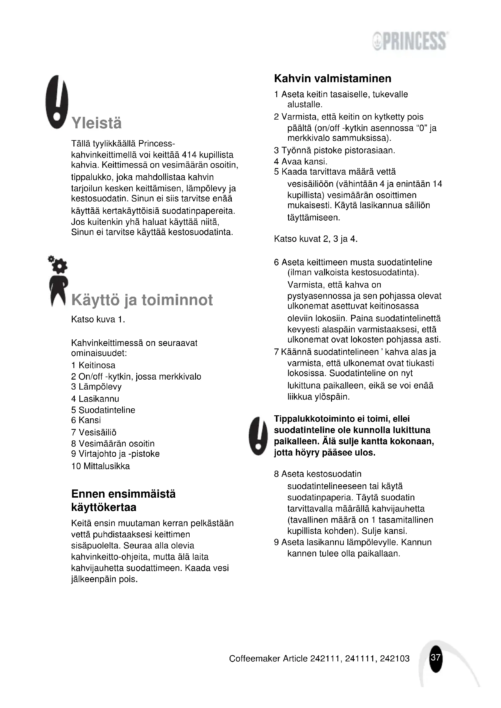 - Rens trakteren nøye etter bruk (se ‘Rengjøring og vedlikehold’). La trakteren avkjøle seg helt før du setter den bort, vedlikeholder og/eller rengjør den. Miljøet Kast emballasje, som plastikk og esker, i de rette avfallsdunkene. Du bør sørge for gjenbruk av trakteren om du ønsker å kaste den mens den ennå er i god stand eller kun trenger mindre reparasjoner. Når trakteren når slutten av sin levetid må den kastes på en ansvarlig måte, for å herved sørge for gjenbruk av (deler av) trakteren. Kast ikke trakteren sammen med usorterte avfall; lever den til butikken, eller ta den med til et godkjent innsamlingssted. Ta kontakt med din kommune for å få informasjon om mottak og innsamlingsopplegg i ditt område.37 Coffeemaker Article 242111, 241111, 242103 Yleistä Tällä tyylikkäällä Princess- kahvinkeittimellä voi keittää 414 kupillista kahvia. Keittimessä on vesimäärän osoitin, tippalukko, joka mahdollistaa kahvin tarjoilun kesken keittämisen, lämpölevy ja kestosuodatin. Sinun ei siis tarvitse enää käyttää kertakäyttöisiä suodatinpapereita. Jos kuitenkin yhä haluat käyttää niitä, Sinun ei tarvitse käyttää kestosuodatinta. Käyttö ja toiminnot Katso kuva 1. Kahvinkeittimessä on seuraavat ominaisuudet: 1 Keitinosa 2 On/off -kytkin, jossa merkkivalo 3 Lämpölevy 4 Lasikannu 5 Suodatinteline 6 Kansi 7 Vesisäiliö 8 Vesimäärän osoitin 9 Virtajohto ja -pistoke 10 Mittalusikka Ennen ensimmäistä käyttökertaa Keitä ensin muutaman kerran pelkästään vettä puhdistaaksesi keittimen sisäpuolelta. Seuraa alla olevia kahvinkeitto-ohjeita, mutta älä laita kahvijauhetta suodattimeen. Kaada vesi jälkeenpäin pois. Kahvin valmistaminen 1 Aseta keitin tasaiselle, tukevalle alustalle. 2 Varmista, että keitin on kytketty pois päältä (on/off -kytkin asennossa “0” ja merkkivalo sammuksissa). 3 Työnnä pistoke pistorasiaan. 4 Avaa kansi. 5 Kaada tarvittava määrä vettä vesisäiliöön (vähintään 4 ja enintään 14 kupillista) vesimäärän osoittimen mukaisesti. Käytä lasikannua säiliön täyttämiseen. Katso kuvat 2, 3 ja 4. 6 Aseta keittimeen musta suodatinteline (ilman valkoista kestosuodatinta). Varmista, että kahva on pystyasennossa ja sen pohjassa olevat ulkonemat asettuvat keitinosassa oleviin lokosiin. Paina suodatintelinettä kevyesti alaspäin varmistaaksesi, että ulkonemat ovat lokosten pohjassa asti. 7 Käännä suodatintelineen ’ kahva alas ja varmista, että ulkonemat ovat tiukasti lokosissa. Suodatinteline on nyt lukittuna paikalleen, eikä se voi enää liikkua ylöspäin. Tippalukkotoiminto ei toimi, ellei suodatinteline ole kunnolla lukittuna paikalleen. Älä sulje kantta kokonaan, jotta höyry pääsee ulos. 8 Aseta kestosuodatin suodatintelineeseen tai käytä suodatinpaperia. Täytä suodatin tarvittavalla määrällä kahvijauhetta (tavallinen määrä on 1 tasamitallinen kupillista kohden). Sulje kansi. 9 Aseta lasikannu lämpölevylle. Kannun kannen tulee olla paikallaan.38 Coffeemaker Article 242111, 241111, 242103 10 Kytke keittimeen virta (on/off -kytkin asentoon “1”). Merkkivalo syttyy. Keitin alkaa nyt valmistaa kahvia. Lämpölevy pitää kahvin kuumana. 11 Voit ottaa kannun pois lämpölevyltä ja kaataa kahvia. Keittimessä on tippalukko, joka mahdollistaa tarjoilun kesken keittämisen. Sen ansiosta kaiken veden ei tarvitse valua säiliöstä kannuun ennen kannun ottamista pois lämpölevyltä. 12 Kytke keitin pois päältä käytön jälkeen (käännä on/off -kytkin asentoon “0”) ja irrota pistoke pistorasiasta. Huolto ja puhdistus