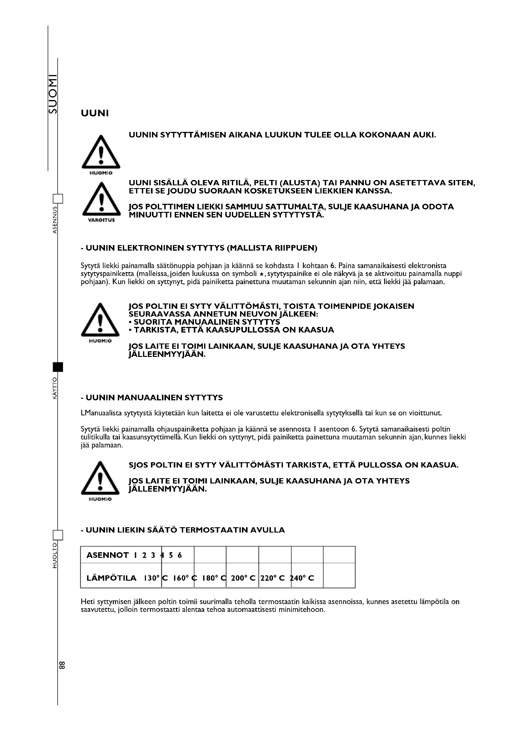 KIINNITYS 85 KÄYTTÖ 86 VAROTOIMIA 86 OHJAUSPANEELI 86 POLTTIMET: 87 UUNI: 88