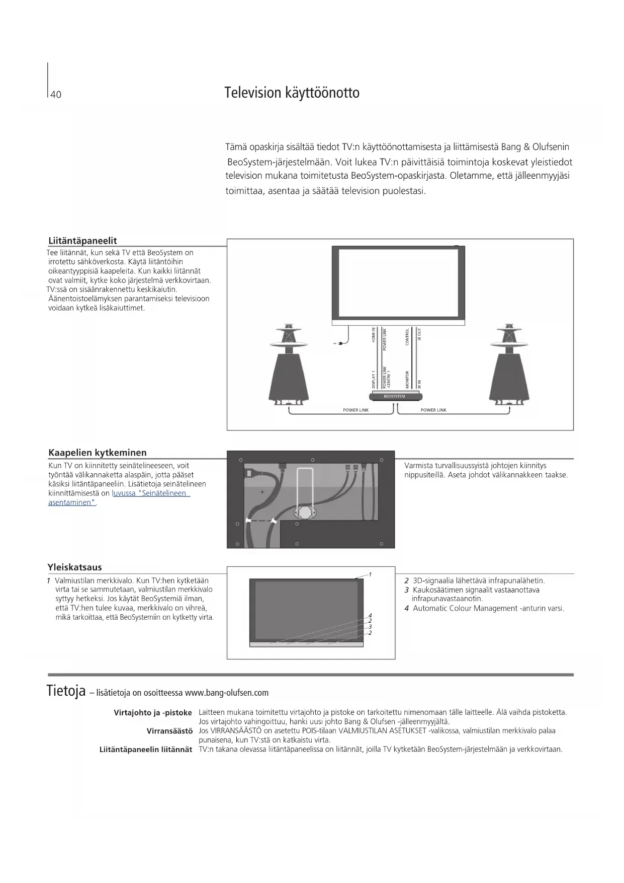 4Tietoja – lisätietoja on osoitteessa www.bang-olufsen.com Virtajohto ja -pistoke Virransäästö Liitäntäpaneelin liitännät Laitteen mukana toimitettu virtajohto ja pistoke on tarkoitettu nimenomaan tälle laitteelle. Älä vaihda pistoketta. Jos virtajohto vahingoittuu, hanki uusi johto Bang& Olufsen -jälleenmyyjältä. Jos VIRRANSÄÄSTÖ on asetettu POIS-tilaan VALMIUSTILAN ASETUKSET -valikossa, valmiustilan merkkivalo palaa punaisena, kun TV:stä on katkaistu virta. TV:n takana olevassa liitäntäpaneelissa on liitännät, joilla TV kytketään BeoSystem-järjestelmään ja verkkovirtaan. Television käyttöönotto Tämä opaskirja sisältää tiedot TV:n käyttöönottamisesta ja liittämisestä Bang & Olufsenin BeoSystem-järjestelmään. Voit lukea TV:n päivittäisiä toimintoja koskevat yleistiedot television mukana toimitetusta BeoSystem-opaskirjasta. Oletamme, että jälleenmyyjäsi toimittaa, asentaa ja säätää television puolestasi. Kaapelien kytkeminen Kun TV on kiinnitetty seinätelineeseen, voit työntää välikannaketta alaspäin, jotta pääset käsiksi liitäntäpaneeliin. Lisätietoja seinätelineen kiinnittämisestä on luvussa "Seinätelineen asentaminen". Liitäntäpaneelit Tee liitännät, kun sekä TV että BeoSystem on irrotettu sähköverkosta. Käytä liitäntöihin oikeantyyppisiä kaapeleita. Kun kaikki liitännät ovat valmiit, kytke koko järjestelmä verkkovirtaan. TV:ssä on sisäänrakennettu keskikaiutin. Äänentoistoelämyksen parantamiseksi televisioon voidaan kytkeä lisäkaiuttimet. Yleiskatsaus 1 Valmiustilan merkkivalo. Kun TV:hen kytketään virta tai se sammutetaan, valmiustilan merkkivalo syttyy hetkeksi. Jos käytät BeoSystemiä ilman, että TV:hen tulee kuvaa, merkkivalo on vihreä, mikä tarkoittaa, että BeoSystemiin on kytketty virta. 2 3D-signaalia lähettävä infrapunalähetin. 3 Kaukosäätimen signaalit vastaanottava infrapunavastaanotin. 4 Automatic Colour Management -anturin varsi. Varmista turvallisuussyistä johtojen kiinnitys nippusiteillä. Aseta johdot välikannakkeen taakse.