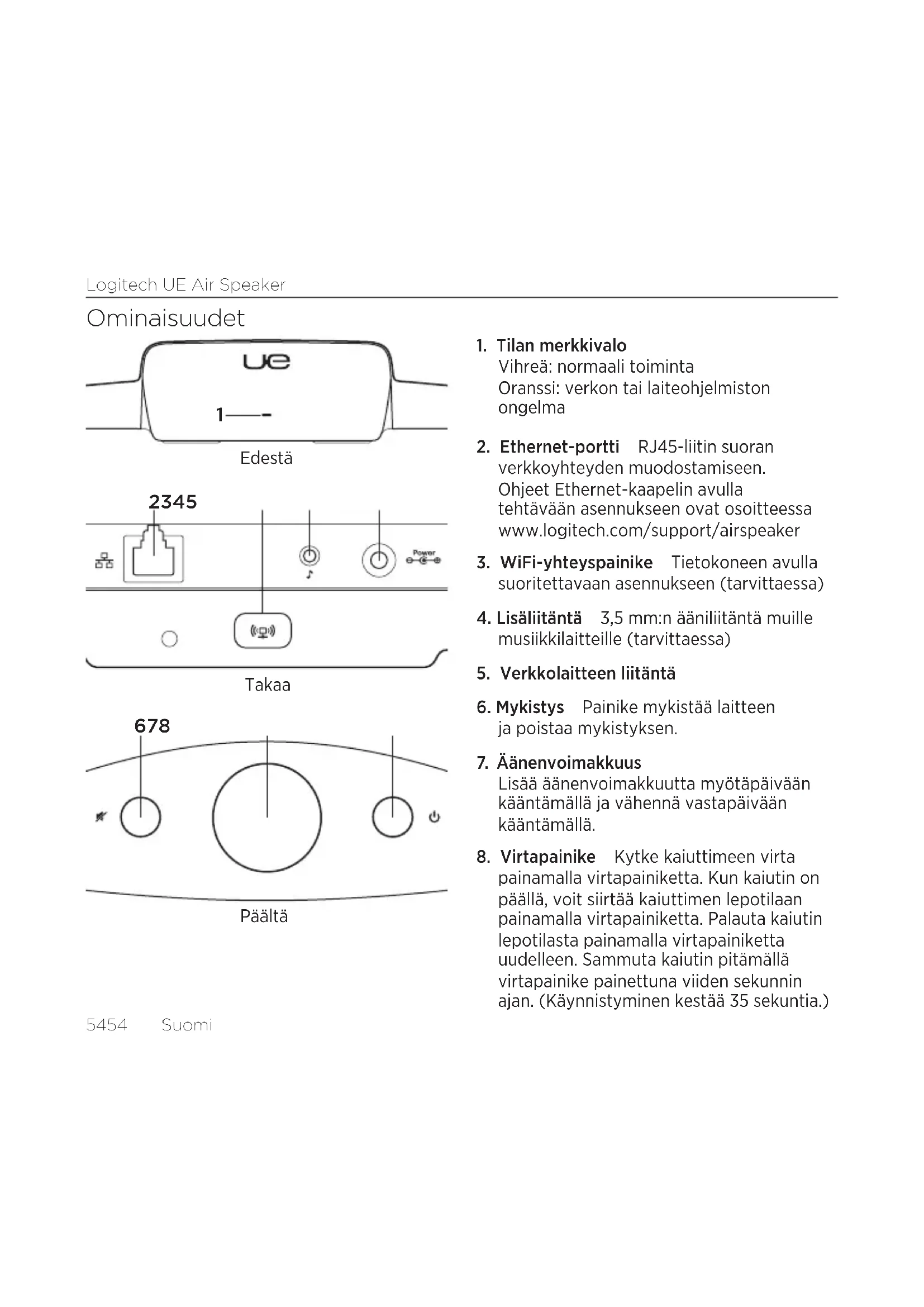 - Jos tilan merkkivalo vilkkuu nopeasti oranssina, kaiuttimessa on laiteohjelmisto- ongelma. Saat tukea osoitteesta www.logitech.com/ support/airspeaker.Logitech UE Air Speaker 5858 Suomi En tiedä langattoman verkon nimeä (SSID) tai salasanaa Katso toimintaohjeita reitittimen tai internetpalveluntarjoajan modeemin tai yhdyskäytävän käyttöoppaasta. Jos tarvitset lisäohjeita, ota yhteyttä reitittimen valmistajaan. Jos kuitenkin käytät modeemia tai yhdyskäytävää, jossa on sisäinen reititin, ota yhteys internetpalveluntarjoajaan. Lisäohjeita Jos sinulla on Logitech UE Air Speaker -kaiutinta koskevia lisäkysymyksiä, käy osoitteessa www.logitech.com/support/ airspeaker. Tilan merkkivalo Kaiuttimen tila VALMIUSTILA PÄÄLLÄ Käynnistymässä (enintään 35 sekuntia) — hitaasti vilkkuva vihreä Verkkoyhteyttä muodostetaan — vilkkuva vihreä Verkkoyhteys muodostettu sykkivä vihreä tasainen vihreä Verkko-ongelma (ei yhteyttä) sykkivä oranssi vilkkuva oranssi Laiteohjelmiston ongelma (ei yhteyttä) sykkivä oranssi nopeasti vilkkuva oranssi WiFi-yhteystila — nopeasti vilkkuva vihreä Mitä mieltä olet? Käytä hetki ja kerro mielipiteesi. Kiitos, että ostit tuotteemme. www.logitech.com/ithinkLogitech UE Air Speaker 59Ελληνvικά 59 Χαρακτηριστικά