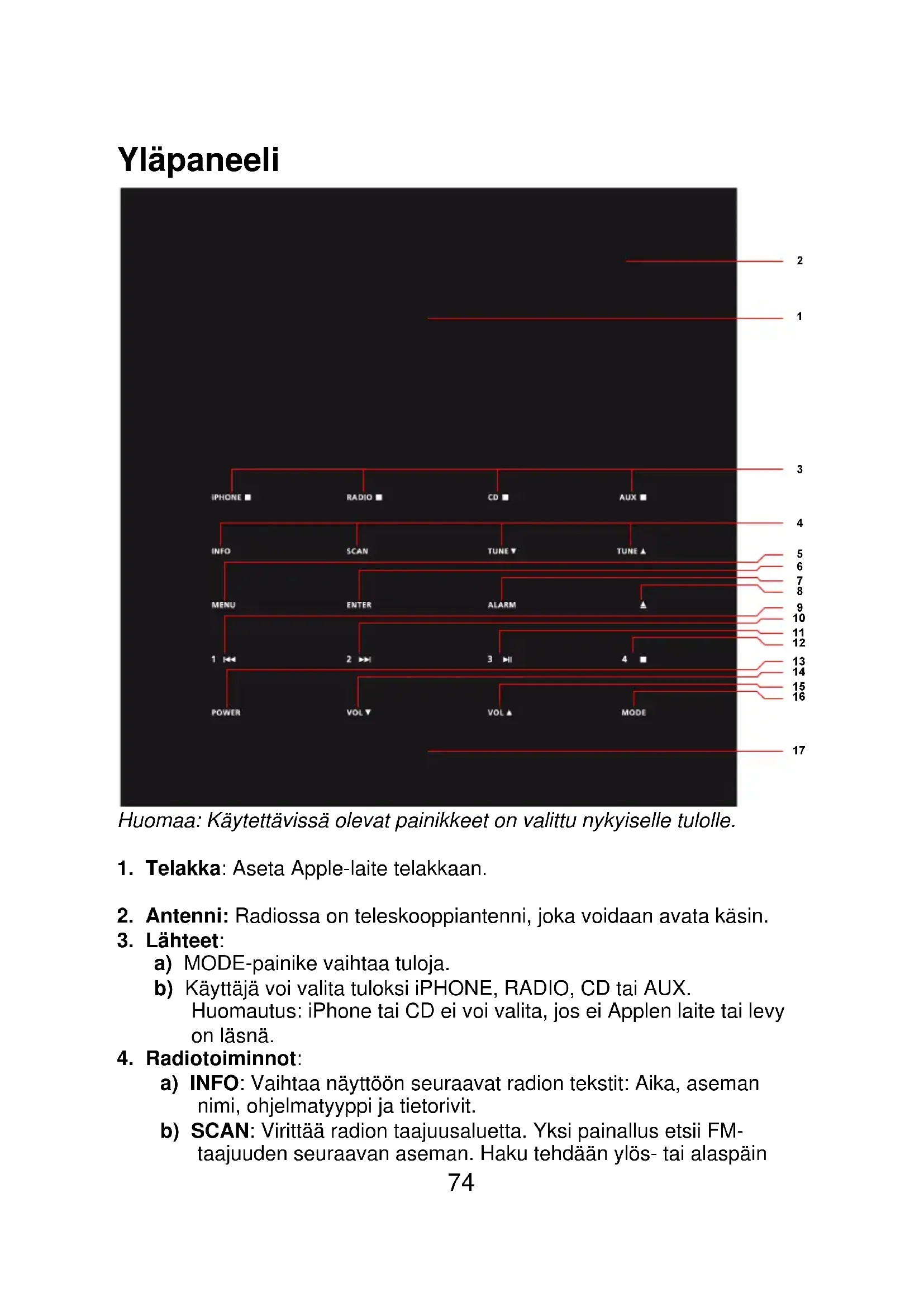 3. MENU (sekä radio että iPhone) ja TOISTO/TAUKO.