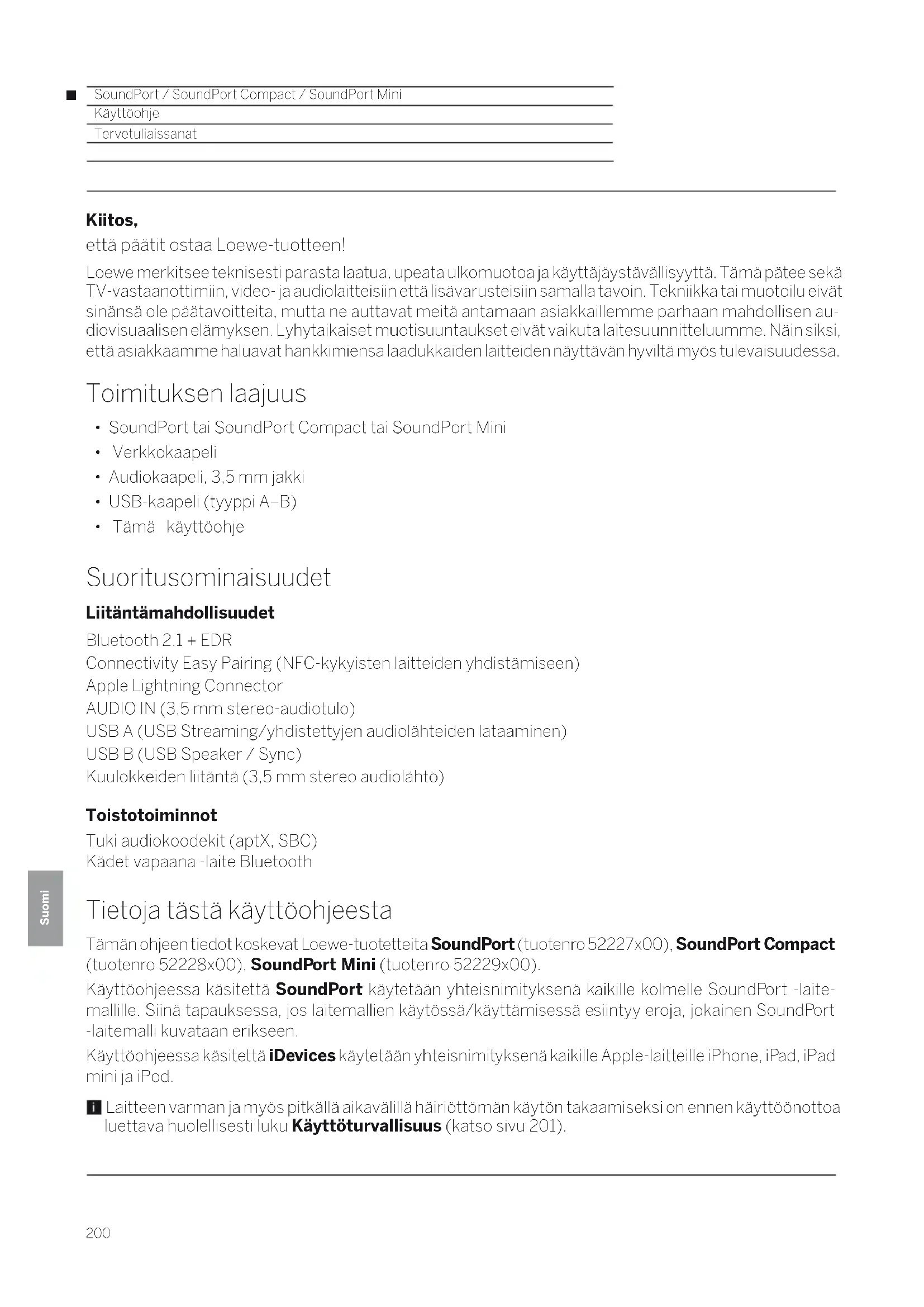 - Tämä käyttöohje Suoritusominaisuudet Liitäntämahdollisuudet Bluetooth 2.1 + EDR Connectivity Easy Pairing (NFC-kykyisten laitteiden yhdistämiseen) Apple Lightning Connector AUDIO IN (3,5 mm stereo-audiotulo) USB A (USB Streaming/yhdistettyjen audiolähteiden lataaminen) USB B (USB Speaker / Sync) Kuulokkeiden liitäntä (3,5 mm stereo audiolähtö) Toistotoiminnot Tuki audiokoodekit (aptX, SBC) Kädet vapaana -laite Bluetooth Tietoja tästä käyttöohjeesta Tämän ohjeen tiedot koskevat Loewe-tuotetteita SoundPort (tuotenro 52227x00), SoundPort Compact (tuotenro 52228x00), SoundPort Mini (tuotenro 52229x00). Käyttöohjeessa käsitettä SoundPort käytetään yhteisnimityksenä kaikille kolmelle SoundPort -laite- mallille. Siinä tapauksessa, jos laitemallien käytössä/käyttämisessä esiintyy eroja, jokainen SoundPort -laitemalli kuvataan erikseen. Käyttöohjeessa käsitettä iDevices käytetään yhteisnimityksenä kaikille Apple-laitteille iPhone, iPad, iPad mini ja iPod. Laitteen varman ja myös pitkällä aikavälillä häiriöttömän käytön takaamiseksi on ennen käyttöönottoa luettava huolellisesti luku Käyttöturvallisuus (katso sivu 201).SoundPort / SoundPort Compact / SoundPort Mini Käyttöohje Suomi