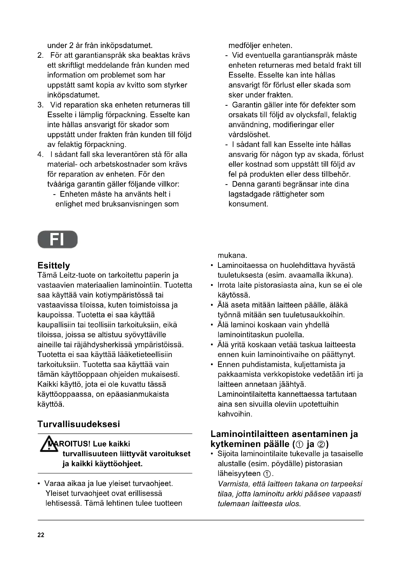 Esittely Tämä Leitz-tuote on tarkoitettu paperin ja vastaavien materiaalien laminointiin. Tuotetta saa käyttää vain kotiympäristössä tai vastaavissa tiloissa, kuten toimistoissa ja kaupoissa. Tuotetta ei saa käyttää kaupallisiin tai teollisiin tarkoituksiin, eikä tiloissa, joissa se altistuu syövyttäville aineille tai räjähdysherkissä ympäristöissä. Tuotetta ei saa käyttää lääketieteellisiin tarkoituksiin. Tuotetta saa käyttää vain tämän käyttöoppaan ohjeiden mukaisesti. Kaikki käyttö, jota ei ole kuvattu tässä käyttöoppaassa, on epäasianmukaista käyttöä. Turvallisuudeksesi VAROITUS! Lue kaikki turvallisuuteen liittyvät varoitukset ja kaikki käyttöohjeet.
