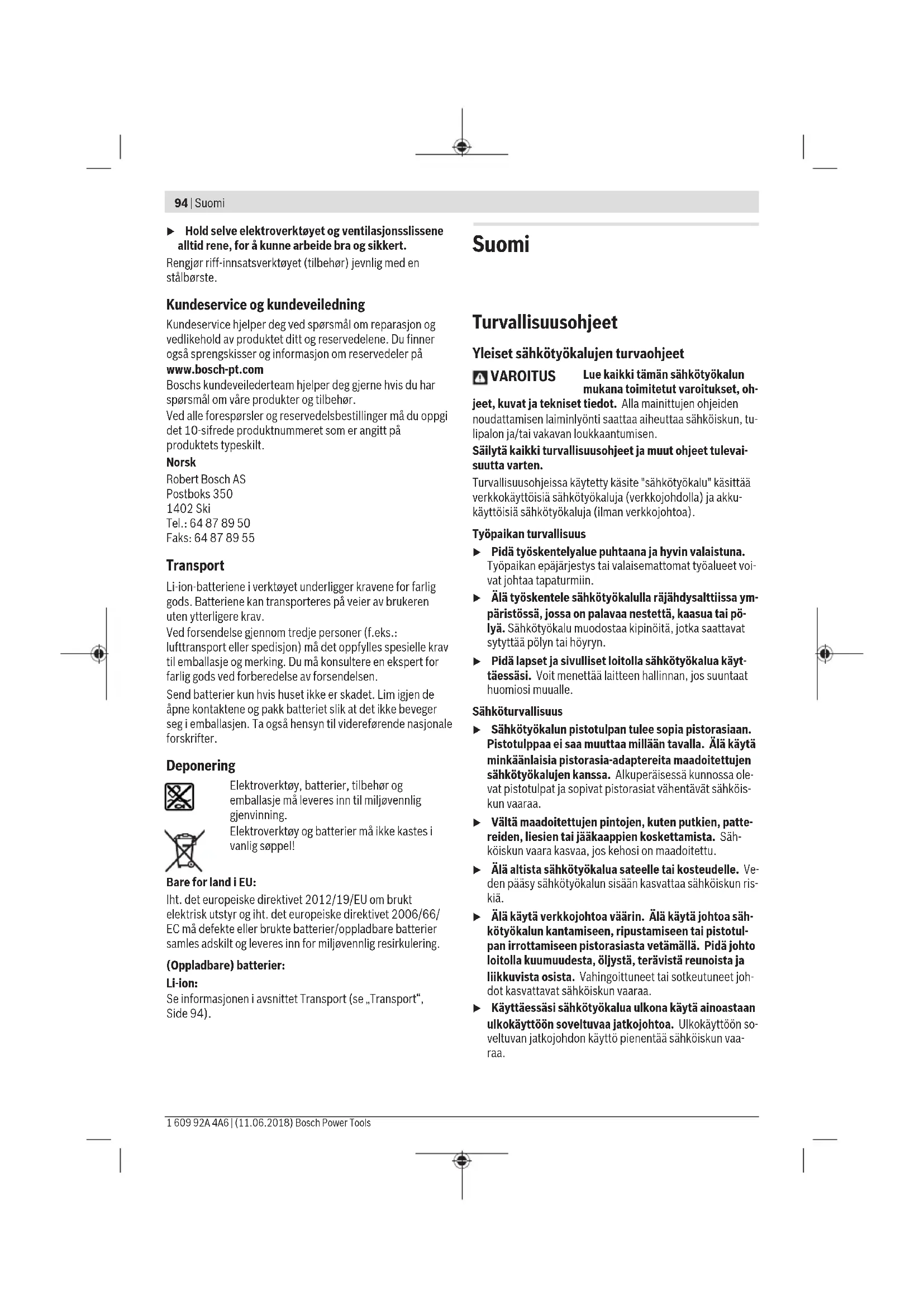 skruelengden. Service og vedlikehold Vedlikehold og rengjøring Ta batteriet ut av elektroverktøyet før alle arbeider på elektroverktøyet utføres (f. eks. vedlikehold, verktøy- skifte osv.) hhv. ved transport og oppbevaring. Det er fare for skader hvis du trykker på på-/av-bryteren ved en feiltagelse. Hold elektroverktøyet og ventilasjonsspaltene alltid rene, for å kunne arbeide bra og sikkert. Hvis batteriet ikke lenger er funksjonsdyktig, må du henvende deg til en autorisert kundeservice for Bosch-elektroverktøy. Kundeservice og rådgivning ved bruk Kundeservicen svarer på dine spørsmål om reparasjon og vedlikehold av produktet samt om reservedeleler. Spreng- skisser og informasjon om reservedeler finner du også på: www.bosch-pt.com Bosch rådgivningsteamet hjelper deg gjerne ved spørsmål an- gående våre produkter og deres tilbehør. Ved alle forespørsler og reservedelsbestillinger må du oppgi det 10-sifrede produktnummeret som er angitt på produktets typeskilt. Norsk Robert Bosch AS Postboks 350 1402 Ski Tel.: 64 87 89 50 Faks: 64 87 89 55 Transport Li-ion-batteriene i verktøyet underligger kravene for farlig gods. Batteriene kan transporteres på veier av brukeren uten ytterligere krav. Ved forsendelse gjennom tredje personer (f. eks.: lufttran- sport eller spedisjon) må det oppfylles spesielle krav til em- ballasje og merking. Du må da konsultere en ekspert for farlig gods ved forberedelse av forsendelsen. Send batterier kun hvis huset ikke er skadet. Lim igjen de åp- ne kontaktene og pakk batteriet slik at det ikke beveger seg i emballasjen. Ta også hensyn til eventuelle videreførende nasjonale for- skrifter. Deponering Elektroverktøy, batterier, tilbehør og emballasje må leveres inn til miljøvennlig gjenvinning. Elektroverktøy og batterier må ikke kastes i vanlig søppel! Kun for EU-land: Iht. det europeiske direktivet 2012/19/EU om gamle elektriske apparater og iht. det europeiske direktivet 2006/66/EC må de- fekte eller oppbrukte batterier/oppladbare batterier samles inn adskilt og leveres inn til en miljøvennlig resirkulering. Batterier/oppladbare batterier: Li-ion: Ta hensyn til informasjonene i avsnit- tet «Transport», side 56. Rett til endringer forbeholdes. LED Kapasitet Kontinuerlig lys 3 x grønn ≥ 2/3 Kontinuerlig lys 2 x grønn ≥1/3 Kontinuerlig lys 1 x grønn < 1/3 Blinklys 1 x grønn Reserve OBJ_BUCH-2907-001.book Page 56 Wednesday, July 27, 2016 9:32 AMSuomi | 57 Bosch Power Tools 1 609 92A 2P0 | (27.7.16) Suomi Turvallisuusohjeita Sähkötyökalujen yleiset turvallisuusohjeet Lue kaikki turvallisuus- ja muut ohjeet. Turvallisuusohjeiden noudattamisen laiminlyönti saattaa johtaa sähköiskuun, tulipaloon ja/tai vakavaan loukkaantumiseen. Säilytä kaikki turvallisuus- ja muut ohjeet tulevaisuutta varten. Turvallisuusohjeissa käytetty käsite ”sähkötyökalu” käsittää verkkokäyttöisiä sähkötyökaluja (verkkojohdolla) ja akku- käyttöisiä sähkötyökaluja (ilman verkkojohtoa). Työpaikan turvallisuus Pidä työskentelyalue puhtaana ja hyvin valaistuna. Työpaikan epäjärjestys tai valaisemattomat työalueet voi- vat johtaa tapaturmiin. Älä työskentele sähkötyökalulla räjähdysalttiissa ym- päristössä, jossa on palavaa nestettä, kaasua tai pölyä. Sähkötyökalu muodostaa kipinöitä, jotka saattavat sytyt- tää pölyn tai höyryt. Pidä lapset ja sivulliset loitolla sähkötyökalua käyttä- essäsi. Voit menettää laitteesi hallinnan huomiosi suun- tautuessa muualle. Sähköturvallisuus Sähkötyökalun pistotulpan tulee sopia pistorasiaan. Pistotulppaa ei saa muuttaa millään tavalla. Älä käytä mitään pistorasia-adaptereita maadoitettujen sähkö- työkalujen kanssa. Alkuperäisessä kunnossa olevat pisto- tulpat ja sopivat pistorasiat vähentävät sähköiskun vaaraa. Vältä koskettamasta maadoitettuja pintoja, kuten put- kia, pattereita, liesiä tai jääkaappeja. Sähköiskun vaara kasvaa, jos kehosi on maadoitettu. Älä aseta sähkötyökalua alttiiksi sateelle tai kosteudel- le. Veden tunkeutuminen sähkötyökalun sisään kasvattaa sähköiskun riskiä. Älä käytä verkkojohtoa väärin. Älä käytä sitä sähkötyö- kalun kantamiseen, ripustamiseen tai pistotulpan ir- rottamiseen pistorasiasta vetämällä. Pidä johto loitolla kuumuudesta, öljystä, terävistä reunoista ja liikkuvista osista. Vahingoittuneet tai sotkeutuneet johdot kasvatta- vat sähköiskun vaaraa. Käyttäessäsi sähkötyökalua ulkona käytä ainoastaan ulkokäyttöön soveltuvaa jatkojohtoa. Ulkokäyttöön so- veltuvan jatkojohdon käyttö pienentää sähköiskun vaaraa. Jos sähkötyökalun käyttö kosteassa ympäristössä ei ole vältettävissä, tulee käyttää vikavirtasuojakytkintä. Vikavirtasuojakytkimen käyttö vähentää sähköiskun vaa- raa. Henkilöturvallisuus Ole valpas, kiinnitä huomiota työskentelyysi ja nouda- ta tervettä järkeä sähkötyökalua käyttäessäsi. Älä käy- tä mitään sähkötyökalua, jos olet väsynyt tai huumei- den, alkoholin tahi lääkkeiden vaikutuksen alaisena. Hetken tarkkaamattomuus sähkötyökalua käytettäessä saattaa johtaa vakavaan loukkaantumiseen. Käytä suojavarusteita. Käytä aina suojalaseja. Henkilö- kohtaisen suojavarustuksen käyttö, kuten pölynaamarin, luistamattomien turvakenkien, suojakypärän tai kuulon- suojaimien, riippuen sähkötyökalun lajista ja käyttötavas- ta, vähentää loukkaantumisriskiä. Vältä tahatonta käynnistämistä. Varmista, että sähkö- työkalu on poiskytkettynä, ennen kuin liität sen sähkö- verkkoon ja/tai liität akun, otat sen käteen tai kannat sitä. Jos kannat sähkötyökalua sormi käynnistyskytkimellä tai kytket sähkötyökalun pistotulpan pistorasiaan käyn- nistyskytkimen ollessa käyntiasennossa, altistat itsesi on- nettomuuksille. Poista kaikki säätötyökalut ja ruuvitaltat, ennen kuin käynnistät sähkötyökalun. Työkalu tai avain, joka sijait- see laittee
