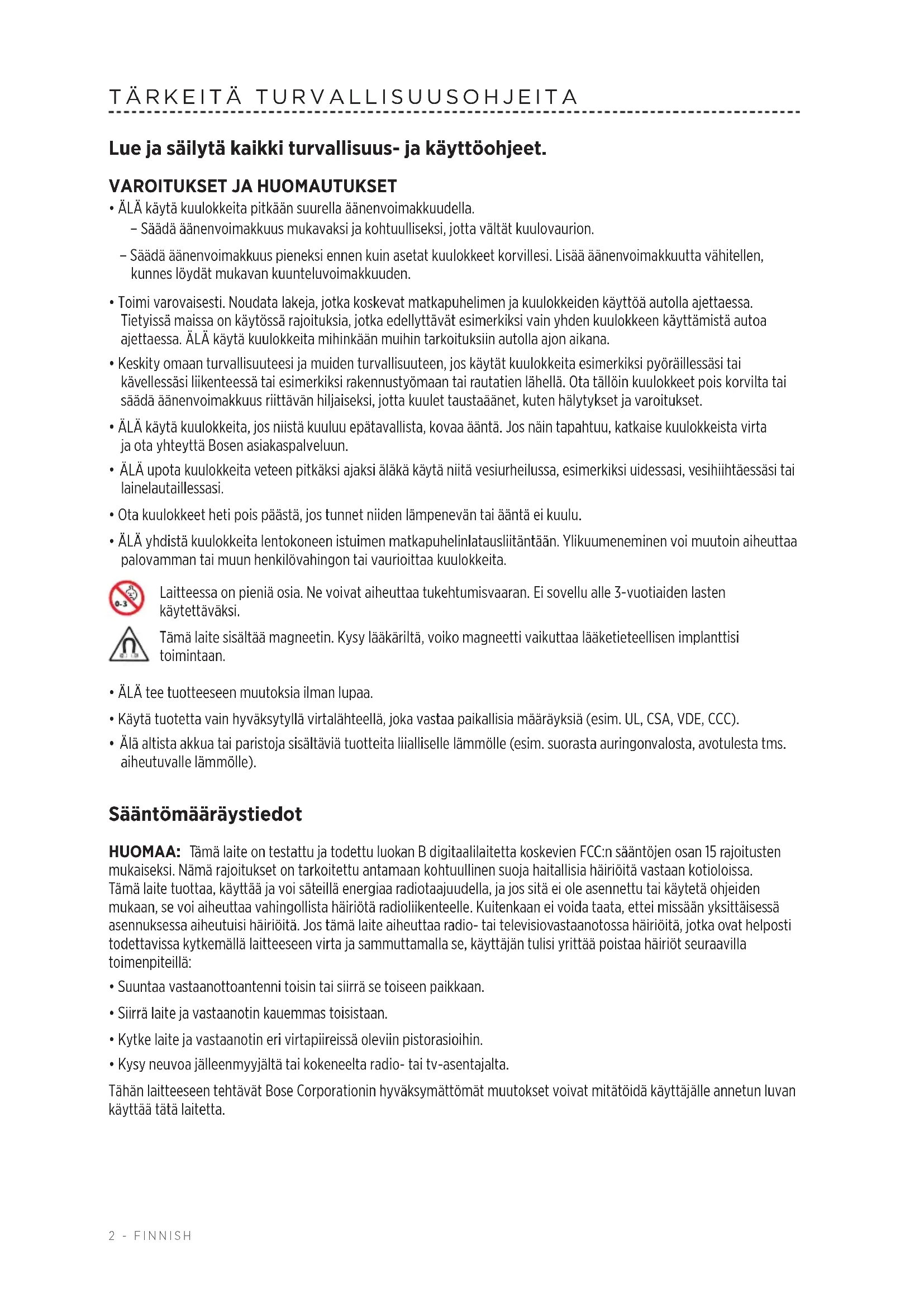 Laite täyttää FCC:n sääntöjen kohdan 15 ja Industry Canadan luvanvaraisuutta koskevat RSS-standardit. Käytön edellytyksenä on kaksi ehtoa: (1) Tämä laite ei saa aiheuttaa haitallisia häiriöitä. (2) Tämän laitteen täytyy ottaa vastaan kaikki häiriöt, mukaan lukien häiriöt, jotka saattavat aiheuttaa ei-toivottua toimintaa. Tämä laite täyttää yleiselle käyttämiselle laaditut FCC- ja Industry Canada -säteilynrajoitusohjeet. Laitetta ja sen antennia ei saa sijoittaa toisen antennin tai lähettimen lähelle. Täyttää IMDA-vaatimukset. CAN ICES-3 (B) /NMB-3 (B) Pientehoisten radiotaajuuslaitteiden hallintasäännökset Artikla XII Pientehoisten radiotaajuuslaitteiden hallintasäännösten (Management Regulation for Low-power Radio-frequency Devices) mukaan mikään yritys, yhtiö tai henkilö ei saa ilman NCC:n myöntämää lupaa muuttaa hyväksyttyjen pientehoisten radiotaajuuslaitteiden taajuutta, parantaa niiden lähetystehoa tai muuttaa niiden alkuperäisiä ominaisuuksia tai suorituskykyä. Artikla XIV Pientehoiset radiotaajuuslaitteet eivät saa vaikuttaa lentokoneiden turvallisuuteen eivätkä häiritä lakisääteistä viestiliikennettä. Jos tällaista todetaan, käyttäjän on lopetettava käyttö välittömästi, kunnes häiriötä ei enää ilmene. Mainitulla lakisääteisellä viestiliikenteellä tarkoitetaan televiestintäasetuksen mukaista radioviestiliikennettä. Pientehoisten radiotaajuuslaitteiden on otettava vastaan lakisääteisen viestiliikenteen tai ISM-radioaaltoja säteilevien laitteiden aiheuttamia häiriöitä. Bose Corporation vakuuttaa täten, että tämä tuote täyttää direktiivin 2014/53/EU sekä muiden sovellettavien EU-direktiivien vaatimukset. Täydellinen vaatimustenmukaisuusvakuutus on osoitteessa www.Bose.com/compliance. Eurooppa: Käytön taajuusalue 2 400–2 483,5 MHz. Bluetooth®: Enimmäislähetysteho alle 20 dBm EIRP. Bluetooth Low Energy: Suurin tehospektritiheys alle 10 dBm/MHz EIRP. Tämä symboli merkitsee, että tuotetta ei saa hävittää kotitalousjätteen mukana, vaan se on toimitettava kierrätykseen. Kierrättäminen auttaa estämään vahingollisia seurauksia ympäristölle, luonnolle ja ihmisten terveydelle. Saat lisätietoja kierrättämisestä paikallisilta viranomaisilta, kotitalousjätteen kierrätyspalvelusta tai liikkeestä, josta tuote ostettiin. Hävitä käytetyt akut ja paristot paikallisten viranomaisten ohjeiden mukaisesti. Ei saa polttaa. Vain pätevä ammattilainen saa irrottaa ladattavan litiumioniakun tästä laitteesta. Lisätietoja saat paikalliselta Bose-jälleenmyyjältä tai osoitteesta http://products.bose.com/static/compliance/index.html.4 - FINNISH