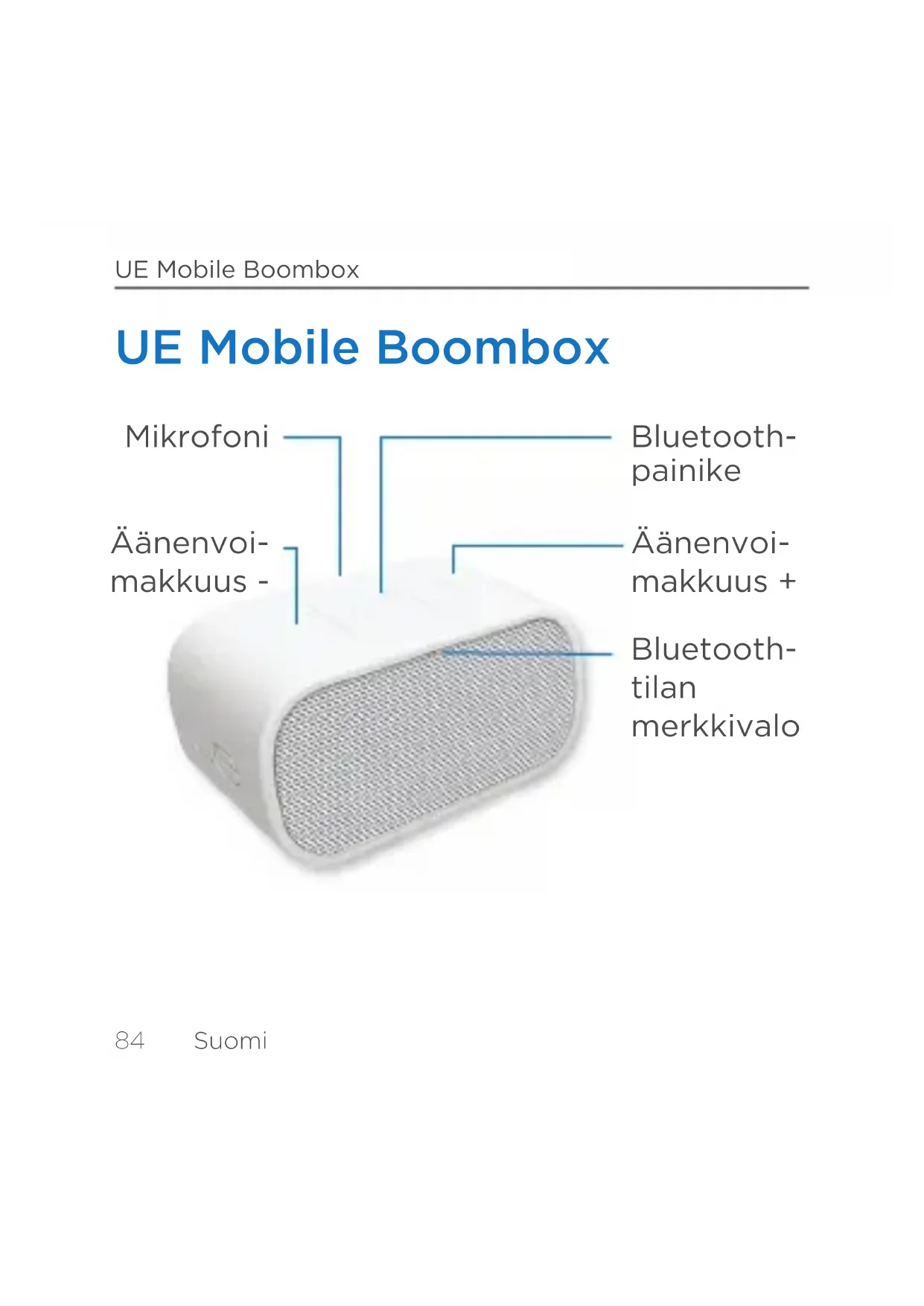 Kundestøtte på Internett Besøk produktsentralen, den nettbaserte portalen til støtte i verdensklasse. logitech.com/support/uemobileboombox Finn veiledninger, feilsøkingstips ogretningslinjer for å bruke UE Mobile Boombox med Bluetooth-enheter. Produktsentralen har også livlige fora, derdukan kommunisere med et globalt fellesskap av kunnskapsrike brukere.Kundestøtte på InternettUE Mobile Boombox 84 Suomi UE Mobile Boombox Bluetooth- painike Mikrofoni Äänenvoi- makkuus + Äänenvoi- makkuus - Bluetooth- tilan merkkivalo Akun merkkivaloUE Mobile Boombox Suomi 85 Äänenvoi- makkuus + Lataus- portti Ääniliitäntä Virta- kytkin Akun merkkivaloUE Mobile Boombox 86 Suomi UE Mobile Boombox -laitteessa Kytke kaiuttimeen virta. Tilan merkkivalo vilkkuu nopeasti. Kaiutin on valmis yhdistettäväksi. Laitteessasi Siirry Asetuksiin jakytke Bluetooth päälle. NapautaUE Mobile Boombox -laitetta laiteluettelosta. Ensimmäinen käyttöönottokerta iUE Mobile Boombox Suomi 87 UE Mobile Boombox -laitteessa Paina Bluetooth-painiketta niin kauan, että tilan merkkivalo alkaa vilkkua nopeasti. Laitteessasi Siirry Bluetooth-asetuksiin. Valitse UE Mobile Boombox lähistöllä olevien Bluetooth- laitteiden luettelosta. Muiden laitteiden määrittäminenUE Mobile Boombox 88 Suomi Laitteessasi Siirry Bluetooth- asetuksiin. ValitseUEMobile Boombox lähistöllä olevien Bluetooth- laitteiden luettelosta. Laitteen yhteyden palauttaminenUE Mobile Boombox Suomi 89 Laitteessasi Kun soitat tai vastaanotat puhelun, valitse äänilähteeksi UE Mobile Boombox. UE Mobile Boombox -laitteessa Puhu kaiuttimen päällä olevaan mikrofoniin. Käyttö kaiutinpuhelimenaUE Mobile Boombox 90 Suomi
