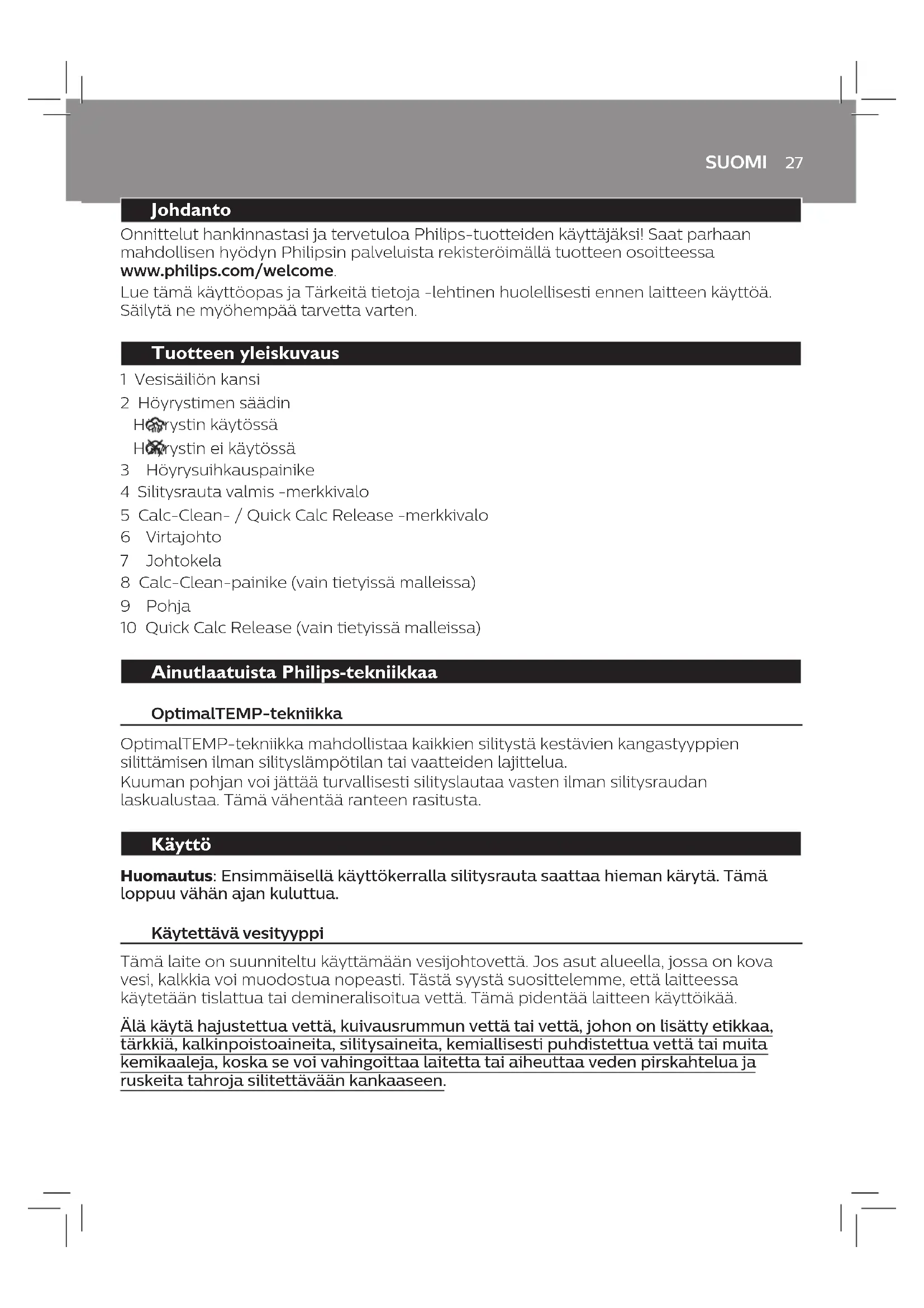 Ongelma Mahdollinen syy Ratkaisu Silitysrauta ei ole riittävän kuuma höyryntuottoa varten. Odota, että Silitysrauta valmis -merkkivalo lakkaa vilkkumasta ja palaa yhtäjaksoisesti. Silityslaudan päällinen kastuu tai silitettävään vaatteeseen tulee vesiroiskeita. Tämä saattaa johtua höyryn tiivistymisestä silityslaudan pintaan pitkän silitystuokion seurauksena. Vaihda silityslaudan päällinen, jos sen sisällä oleva vaahtomuovi on kulunut. Voit myös lisätä ylimääräisen huopakerroksen silityslaudan suojuksen alle estämään veden tiivistymistä. Huopaa voi ostaa kangaskaupasta. Käyttämääsi silityslaudan päällistä ei ole suunniteltu kestämään laitteen suurta höyrymäärää. Aseta ylimääräinen kerros huopamateriaalia silityslaudan päällisen alle estämään kosteuden tiivistymistä silityslaudalla. Huopaa voi ostaa kangaskaupasta. Vaatteelle tippuu vesipisaroita silityksen aikana. Olet käyttänyt höyrysuihkaustoimintoa liian usein lyhyen ajan kuluessa. Jatka silittämistä vaaka-asennossa ja odota hetki, ennen kuin käytät höyrysuihkausta uudelleen. Vesisäiliön kantta ei ole suljettu oikein. Paina kantta, kunnes se napsahtaa paikalleen. Quick Calc Release -poistosäiliötä ei ole asetettu kunnolla paikalleen (vain tietyissä malleissa). Lopeta silittäminen ja anna laitteen jäähtyä vähintään 1 tunnin ajan. Irrota Quick Calc Release -poistosäiliö. Aseta se takaisin paikalleen ja tarkista, että se on samassa tasossa laitteen ulkopinnan kanssa. Paina lukitusvipu alas. Jos Quick Calc Release -poistosäiliö on vioittunut, ota yhteyttä oman maasi kuluttajapalvelukeskukseen (yhteystiedot ovat kansainvälisessä takuulehtisessä). Höyrysuihkaus ei toimi. Olet käyttänyt höyrysuihkaustoimintoa liian usein lyhyen ajan kuluessa. Jatka silittämistä vaaka-asennossa ja odota hetki, ennen kuin käytät höyrysuihkausta uudelleen. Silitysrauta ei ole riittävän kuuma silittämistä varten. Odota, että Silitysrauta valmis -merkkivalo lakkaa vilkkumasta ja palaa yhtäjaksoisesti. Olet lisännyt vesisäiliöön jotain kemikaalia. Huuhtele vesisäiliö, äläkä laita sinne hajusteita tai kemikaaleja. Silityksen aikana pohjasta tulee likaista vettä ja muita epäpuhtauksia. Epäpuhtauksia tai kemikaaleja sisältävä kova vesi on muodostanut kalkkihiutaleita pohjan sisäpuolelle. Käytä Quick Calc Release -toimintoa (vain tietyissä malleissa) tai Calc-Clean -toimintoa (vain tietyissä malleissa). Lisätietoja on kohdassa Puhdistus ja huolto. Vesipisaroita valuu pohjasta, kun silitysraudan pistoke on irrotettu pistorasiasta. Höyryrauta on laitettu vaaka- asentoon, kun vesisäiliössä on vielä vettä. Tyhjennä vesisäiliö käytön jälkeen tai säilytä silitysrautaa pystyasennossa. Höyrystimen säädin on asennossa . Aseta höyrystimen säädin asentoon . Silitysraudan kädensijassa vilkkuu keltainen merkkivalo. Calc-Clean-toiminnon merkki valo syttyy ja muistuttaa kalkinpuhdistuksen tarpeellisuudesta. Käytä Quick Calc Release -toimintoa (vain tietyissä malleissa) tai Calc-Clean -toimintoa (vain tietyissä malleissa). Lisätietoja on kohdassa Puhdistus ja huolto. Silitysraudasta jää vaatteeseen kiiltoa tai jälkiä. Silitettävä pinta ei ole tasainen, koska silityskohdassa on esimerkiksi sauma tai vaatteen taitos. Silitysrautaa voi käyttää turvallisesti kaikille silitettäville vaatteille. Kiilto tai jälki eivät ole pysyviä vaan häviävät, kun peset vaatteen seuraavan kerran. Vältä silitystä saumojen tai taitosten päältä. Voit myös asettaa silityskohdan päälle puuvillakankaan, jotta vaatteeseen ei jäisi jälkiä.31 NORSK Introduksjon Gratulerer med kjøpet og velkommen til Philips. Hvis du vil dra full nytte av støtten som Philips tilbyr, kan du registrere produktet ditt på www.philips.com/welcome. Les denne brukerhåndboken og det viktige informasjonsheftet nøye før du bruker apparatet. Ta vare på disse for fremtidig bruk. Produktoversikt 1 Lokk til vannbeholder 2 Dampskyvebryter Damp på Damp av 3 Dampstøtknapp 4 Lampe som indikerer at strykejernet er klart 5 Påminnelseslampe for kalkrensfunksjon / rask kalkfjerning 6 Nettledning 7 Ledningskveiler 8 Knapp for kalkrens (kun bestemte typer) 9 Strykesåle 10 Rask kalkfjerning (kun bestemte typer) Eksklusiv teknologi fra Philips OptimalTEMP-teknologi OptimalTEMP-teknologi gjør det mulig for deg å stryke alle slags strykbare stoer i hvilken som helst rekkefølge, uten å justere strykejernets temperatur eller sortere tøyet. Det er trygt bare å la den varme strykesålen stå rett på strykebrettet og ikke sette jernet tilbake på strykejernplattformen. Dette reduserer belastningen på håndleddet. Bruke apparatet Merk: Strykejernet kan avgi litt røyk når du bruker det for første gang. Dette gir seg etter en liten stund. Hvilken type vann skal brukes Dette apparatet er utformet for bruk med springvann. Hvis du bor i et område med hardt vann, kan det raskt danne seg mye kalk. Derfor anbefaler vi at du bruker destillert eller avsaltet vann for å forlenge levetiden til apparatet. Ikke bruk parfymert vann, vann fra en tørketrommel, eddik, stivelse, avkalkingsmidler, strykemidler, kjemisk avkalket vann eller andre kjemikalier, ettersom dette kan føre til vannsprut, brune ekker eller skade på apparatet.NORSK