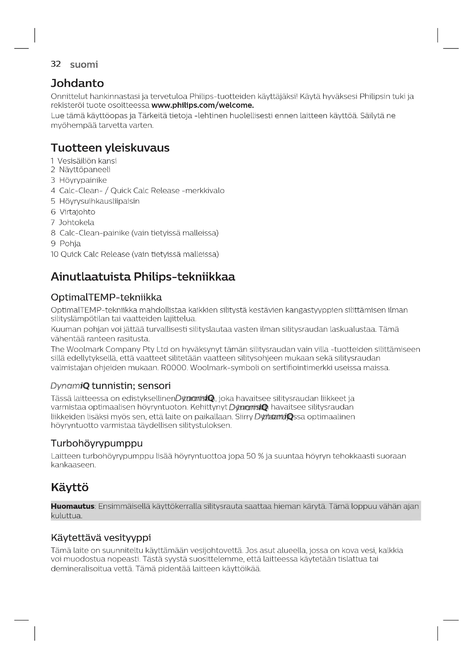 DanskJohdanto Onnittelut hankinnastasi ja tervetuloa Philips-tuotteiden käyttäjäksi! Käytä hyväksesi Philipsin tuki ja rekisteröi tuote osoitteessa www.philips.com/welcome. Lue tämä käyttöopas ja Tärkeitä tietoja -lehtinen huolellisesti ennen laitteen käyttöä. Säilytä ne myöhempää tarvetta varten. Tuotteen yleiskuvaus 1 Vesisäiliön kansi 2 Näyttöpaneeli 3 Höyrypainike 4 Calc-Clean- / Quick Calc Release -merkkivalo 5 Höyrysuihkausliipaisin 6 Virtajohto 7 Johtokela 8 Calc-Clean-painike (vain tietyissä malleissa) 9 Pohja 10 Quick Calc Release (vain tietyissä malleissa) Ainutlaatuista Philips-tekniikkaa OptimalTEMP-tekniikka OptimalTEMP-tekniikka mahdollistaa kaikkien silitystä kestävien kangastyyppien silittämisen ilman silityslämpötilan tai vaatteiden lajittelua. Kuuman pohjan voi jättää turvallisesti silityslautaa vasten ilman silitysraudan laskualustaa. Tämä vähentää ranteen rasitusta. The Woolmark Company Pty Ltd on hyväksynyt tämän silitysraudan vain villa -tuotteiden silittämiseen sillä edellytyksellä, että vaatteet silitetään vaatteen silitysohjeen mukaan sekä silitysraudan valmistajan ohjeiden mukaan. R0000. Woolmark-symboli on sertiointimerkki useissa maissa. tunnistin; sensori Tässä laitteessa on edistyksellinen -tunnistin, joka havaitsee silitysraudan liikkeet ja varmistaa optimaalisen höyryntuoton. Kehittynyt -tunnistin havaitsee silitysraudan liikkeiden lisäksi myös sen, että laite on paikallaan. Siirry -tilaan, jossa optimaalinen höyryntuotto varmistaa täydellisen silitystuloksen. Turbohöyrypumppu Laitteen turbohöyrypumppu lisää höyryntuottoa jopa 50 % ja suuntaa höyryn tehokkaasti suoraan kankaaseen. Käyttö Huomautus: Ensimmäisellä käyttökerralla silitysrauta saattaa hieman kärytä. Tämä loppuu vähän ajan kuluttua. Käytettävä vesityyppi Tämä laite on suunniteltu käyttämään vesijohtovettä. Jos asut alueella, jossa on kova vesi, kalkkia voi muodostua nopeasti. Tästä syystä suosittelemme, että laitteessa käytetään tislattua tai demineralisoitua vettä. Tämä pidentää laitteen käyttöikää.