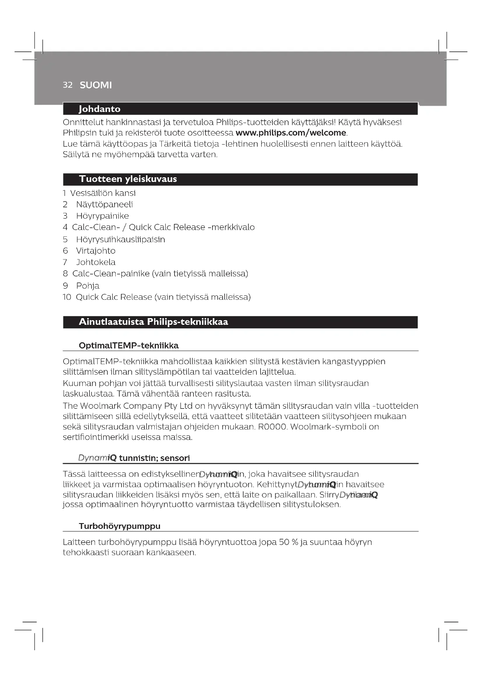 Ongelma Mahdollinen syy Ratkaisu Käyttämääsi silityslaudan päällistä ei ole suunniteltu kestämään laitteen suurta höyrymäärää. Aseta ylimääräinen kerros huopamateriaalia silityslaudan päällisen alle estämään kosteuden tiivistymistä silityslaudalla. Huopaa voi ostaa kangaskaupasta. Vaatteelle tippuu vesipisaroita silityksen aikana. Olet käyttänyt höyrysuihkaustoimintoa liian usein lyhyen ajan kuluessa. Jatka silittämistä vaaka-asennossa ja odota hetki, ennen kuin käytät höyrysuihkausta uudelleen. Vesisäiliön kantta ei ole suljettu oikein. Paina kantta, kunnes se napsahtaa paikalleen. Quick Calc Release -poistosäiliötä ei ole asetettu kunnolla paikalleen (vain tietyissä malleissa). Lopeta silittäminen ja anna laitteen jäähtyä vähintään 1 tunnin ajan. Irrota Quick Calc Release -poistosäiliö. Aseta se takaisin paikalleen ja tarkista, että se on samassa tasossa laitteen ulkopinnan kanssa. Paina lukitusvipu alas. Jos Quick Calc Release -poistosäiliö on vioittunut, ota yhteyttä oman maasi kuluttajapalvelukeskukseen (yhteystiedot ovat kansainvälisessä takuulehtisessä). Olet lisännyt vesisäiliöön jotain kemikaalia. Huuhtele vesisäiliö, äläkä laita sinne hajusteita tai kemikaaleja. Höyrysuihkaus ei toimi. Olet käyttänyt höyrysuihkaustoimintoa liian usein lyhyen ajan kuluessa. Jatka silittämistä vaaka-asennossa ja odota hetki, ennen kuin käytät höyrysuihkausta uudelleen. Olet aloittanut silittämisen ennen kuin silitysrauta on valmis Odota, kunnes silitysrauta on valmis (näyttöpaneelin merkkivalo ei enää vilku). Silityksen aikana pohjasta tulee likaista vettä ja muita epäpuhtauksia. Epäpuhtauksia tai kemikaaleja sisältävä kova vesi on muodostanut kalkkihiutaleita pohjan sisäpuolelle. Käytä Quick Calc Release -toimintoa (vain tietyissä malleissa) tai Calc-Clean-toimintoa (vain tietyissä malleissa). Lisätietoja on kohdassa Puhdistus ja huolto. Silitysraudan kädensijassa vilkkuu keltainen merkkivalo. Calc-Clean-toiminnon merkki valo syttyy ja muistuttaa kalkinpuhdistuksen tarpeellisuudesta. Käytä Quick Calc Release -toimintoa (vain tietyissä malleissa) tai Calc-Clean-toimintoa (vain tietyissä malleissa). Lisätietoja on kohdassa Puhdistus ja huolto. Silitysraudasta jää vaatteeseen kiiltoa tai jälkiä. Silitettävä pinta ei ole tasainen, koska silityskohdassa on esimerkiksi sauma tai vaatteen taitos. Silitysrautaa voi käyttää turvallisesti kaikille silitettäville vaatteille. Kiilto tai jälki eivät ole pysyviä vaan häviävät, kun peset vaatteen seuraavan kerran. Vältä silitystä saumojen tai taitosten päältä. Voit myös asettaa silityskohdan päälle puuvillakankaan, jotta vaatteeseen ei jäisi jälkiä. Laitteesta kuuluu kova ääni. Vesisäiliössä ei ole vettä. Lisää vettä vesisäiliöön.37 NORSK Introduksjon Gratulerer med kjøpet og velkommen til Philips. Hvis du vil ha fullt utbytte av støtten som Philips tilbyr, kan du registrere produktet på www.Philips.com/welcome. Les denne brukerhåndboken og det viktige informasjonsheftet nøye før du bruker apparatet. Ta vare på disse for fremtidig bruk. Produktoversikt 1 Lokk til vannbeholder 2 Displaypanel 3 Dampknapp 4 Påminnelseslampe for kalkrensfunksjon / rask kalkfjerning 5 Dampstøtutløser 6 Nettledning 7 Ledningskveiler 8 Knapp for kalkrens (kun bestemte modeller) 9 Strykesåle 10 Rask kalkfjerning (kun bestemte modeller) Eksklusiv teknologi fra Philips OptimalTEMP-teknologi OptimalTEMP-teknologi gjør det mulig for deg å stryke alle slags strykbare stoer i hvilken som helst rekkefølge, uten å justere strykejernets temperatur eller sortere tøyet. Det er trygt bare å la den varme strykesålen stå rett på strykebrettet og ikke sette jernet tilbake på strykejernplattformen. Dette reduserer belastningen på håndleddet. Dette strykejernet er godkjent av The Woolmark Company Pty Ltd for stryking av rene ullprodukter såfremt plaggene strykes i henhold til anvisningene på plagget og anvisningen gitt av produsenten av dette strykejernet. R0000. Woolmark-symbolet er sertiseringsmerket i mange land. sensor Dette apparatet bruker den mest avanserte -sensoren som registrerer strykejernets bevegelser presist, og utløser damp på en intelligent måte for å gi perfekte resultater. Den avanserte -sensoren vet nøyaktig hvordan strykejernet beveger seg, og når det står i ro. Bare bytt til -modusen, så får du alltid perfekt mengde damp når du trenger å få bort skrukker raskere. Turbodamppumpe Vi har lagt til en turbodamppumpe på dette apparatet for å gi opptil 50 % mer damp direkte gjennom stomaterialet, slik at skrukkene raskt forsvinner.NORSK