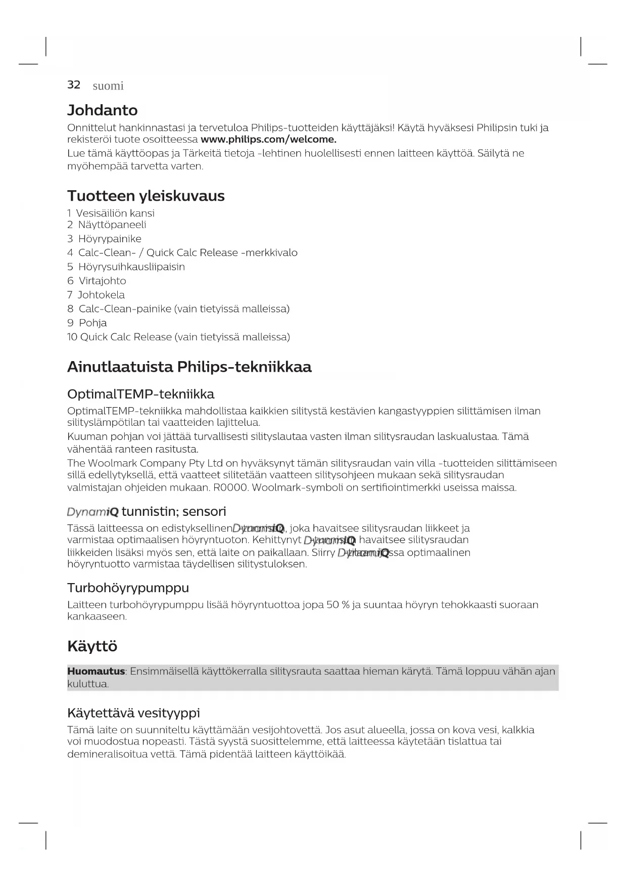 DanskJohdanto Onnittelut hankinnastasi ja tervetuloa Philips-tuotteiden käyttäjäksi! Käytä hyväksesi Philipsin tuki ja rekisteröi tuote osoitteessa www.philips.com/welcome. Lue tämä käyttöopas ja Tärkeitä tietoja -lehtinen huolellisesti ennen laitteen käyttöä. Säilytä ne myöhempää tarvetta varten. Tuotteen yleiskuvaus 1 Vesisäiliön kansi 2 Näyttöpaneeli 3 Höyrypainike 4 Calc-Clean- / Quick Calc Release -merkkivalo 5 Höyrysuihkausliipaisin 6 Virtajohto 7 Johtokela 8 Calc-Clean-painike (vain tietyissä malleissa) 9 Pohja 10 Quick Calc Release (vain tietyissä malleissa) Ainutlaatuista Philips-tekniikkaa OptimalTEMP-tekniikka OptimalTEMP-tekniikka mahdollistaa kaikkien silitystä kestävien kangastyyppien silittämisen ilman silityslämpötilan tai vaatteiden lajittelua. Kuuman pohjan voi jättää turvallisesti silityslautaa vasten ilman silitysraudan laskualustaa. Tämä vähentää ranteen rasitusta. The Woolmark Company Pty Ltd on hyväksynyt tämän silitysraudan vain villa -tuotteiden silittämiseen sillä edellytyksellä, että vaatteet silitetään vaatteen silitysohjeen mukaan sekä silitysraudan valmistajan ohjeiden mukaan. R0000. Woolmark-symboli on sertiointimerkki useissa maissa. tunnistin; sensori Tässä laitteessa on edistyksellinen -tunnistin, joka havaitsee silitysraudan liikkeet ja varmistaa optimaalisen höyryntuoton. Kehittynyt -tunnistin havaitsee silitysraudan liikkeiden lisäksi myös sen, että laite on paikallaan. Siirry -tilaan, jossa optimaalinen höyryntuotto varmistaa täydellisen silitystuloksen. Turbohöyrypumppu Laitteen turbohöyrypumppu lisää höyryntuottoa jopa 50 % ja suuntaa höyryn tehokkaasti suoraan kankaaseen. Käyttö Huomautus: Ensimmäisellä käyttökerralla silitysrauta saattaa hieman kärytä. Tämä loppuu vähän ajan kuluttua. Käytettävä vesityyppi Tämä laite on suunniteltu käyttämään vesijohtovettä. Jos asut alueella, jossa on kova vesi, kalkkia voi muodostua nopeasti. Tästä syystä suosittelemme, että laitteessa käytetään tislattua tai demineralisoitua vettä. Tämä pidentää laitteen käyttöikää.