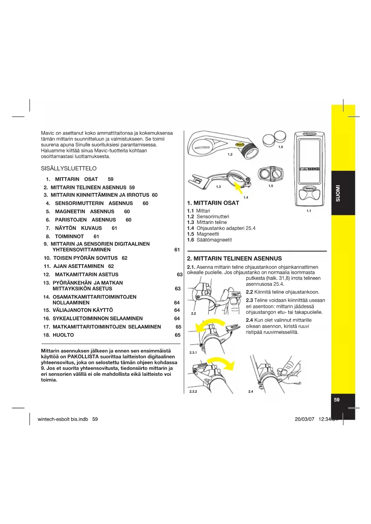 oikean asennon, kiristä ruuvi ristipää ruuvimeisselillä. Mavic on asettanut koko ammattitaitonsa ja kokemuksensa tämän mittarin suunnitteluun ja valmistukseen. Se toimii suurena apuna Sinulle suorituksiesi parantamisessa. Haluamme kiittää sinua Mavic-tuotteita kohtaan osoittamastasi luottamuksesta. SISÄLLYSLUETTELO