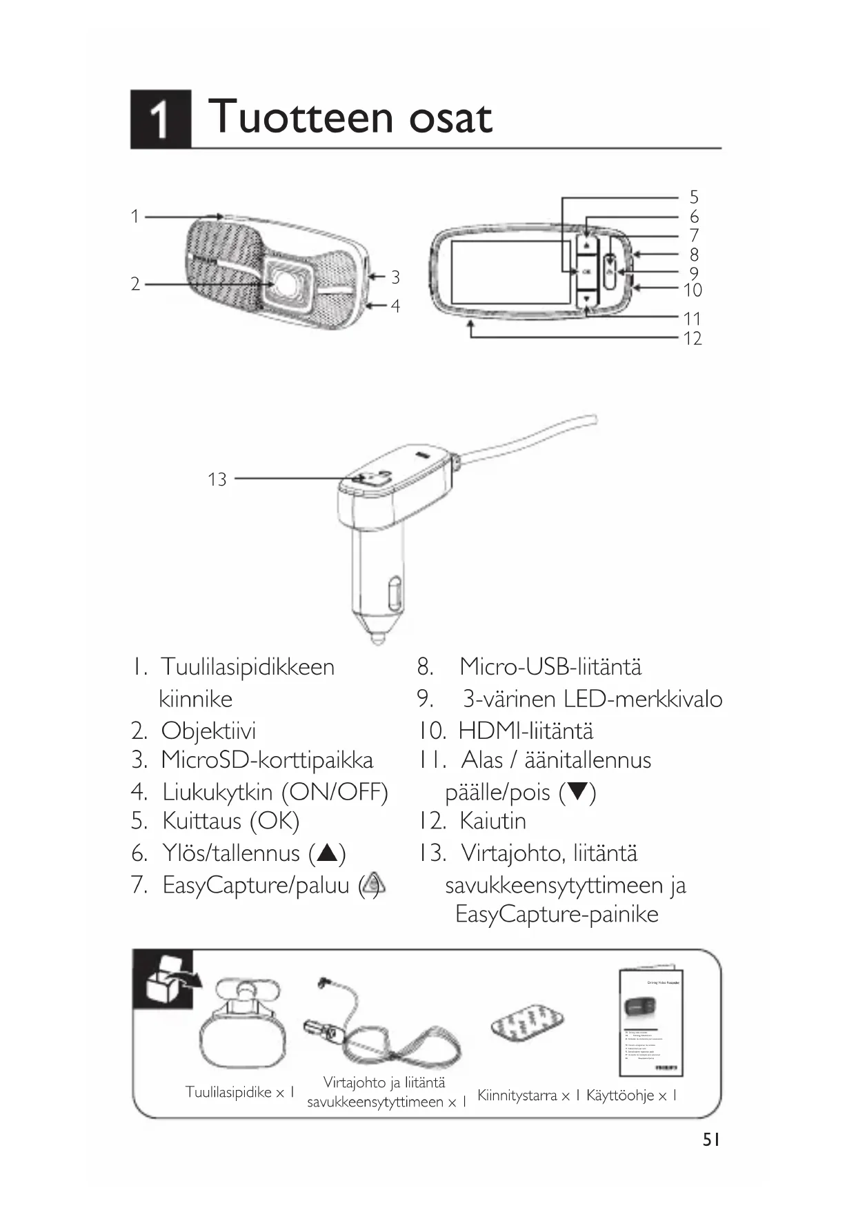 Philips EasyCapture -toiminto varmistaa, että sinulla on aina hätätallennuspainike käden ulottuvilla, jotta voit tallentaa kaikki tapahtumat tien päällä. Yksi selkeästi merkitty painike sijaitsee laitteessa ja toinen savukkeensytyttimen sovittimessa. Paina vain EasyCapture-painiketta (nro 13 tuotteen osissa), kun haluat tallentaa ja suojata videon, joka kestää yhteensä enintään 6 minuuttia ennen hätäpainikkeen painamista ja sen jälkeen. Tallennetiedosto suojataan, eikä sitä voida poistaa, jollet käy manuaalisesti poistamassa tiedoston lukitusta hätätallenteiden kansiosta tai jollei hätätallenteiden kansio ole täynnä. Tiedostojen määrä riippuu SD-kortin koosta.65 Toiminnot Automaattinen tallennus Törmäyksentunnistus ja hätätiedostojen suojaus Jatkuva silmukkatallennus Automaattinen valotus Automaattinen valkotasapaino Päivämäärä- ja aikamerkintä Näytön automaattinen sammutus Kuljettajan väsymyksen tunnistus ja väsymystason näyttö EasyCapture-hätätallennuspainikkeet Laajakulma Edistyksellinen yönäkyvyys Kuva-anturi 2,1 megapikselin CMOS Videon resoluutio Full HD (1920 x 1080 p), 30 fps HD Premium (1280 x 720 p), 60 fps HD Premium (1280 x 720 p), 30 fps Näyttö 2,7 tuuman nestekidenäyttö Aukkosuhde F/2.0 Kiinteän polttovälin objektiivi Laajakulmaobjektiivi 7G, kuvakenttä (FOV) 156 astetta (diagonaalinen) Tiedostomuoto .MOV Äänenpakkaus PCM / videonpakkaus H.264 Käyttömuisti (RAM) 64 M x 16 bittiä (1 Gbit) DDR3 SDRAM Keskusmuisti 32 Mt SPI Flash Tallennusväline (ulkoinen muisti) MicroSD-kortti (vähintään luokka 6, enintään 32 Gt) Tallennusaika 160 min /16 Gt / full HD 320 min / 32 Gt / full HD RTC 5 päivää Käyttölämpötila -10℃ ~ 65℃ Varastointilämpötila -20℃ ~ 70℃ Varusteet Micro-USB-autolaturi, 3M-tuulilasipidike, pikaopas Liitännät Micro-USB 2.0, HDMI, MicroSD- korttipaikka, mikrofoni, kaiutin Kielet Englanti, ranska, saksa, italia, espanja, portugali, puola ja venäjä Virransyöttö 12–24 V / 5 V / 1 A:n autosovitin, jossa EasyCapture-tallennuspainike Mitat (P x L x K) 106.7 x 50.0 x 32.5mm Tekniset tiedot 71 Aperçu du produit...........................................................................51 2 Démarrage rapide ...........................................................................52