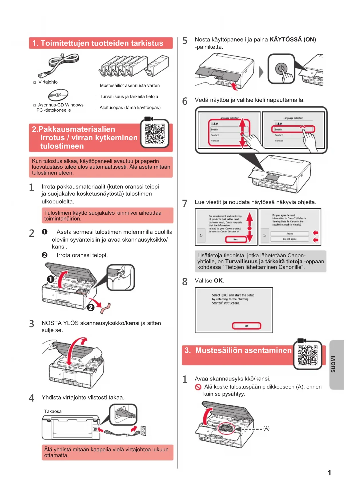 □ Asennus-CD Windows PC -tietokoneelle□ Virtajohto□ Turvallisuus ja tärkeitä tietoja□ Mustesäiliöt asennusta varten□ Aloitusopas (tämä käyttöopas)
