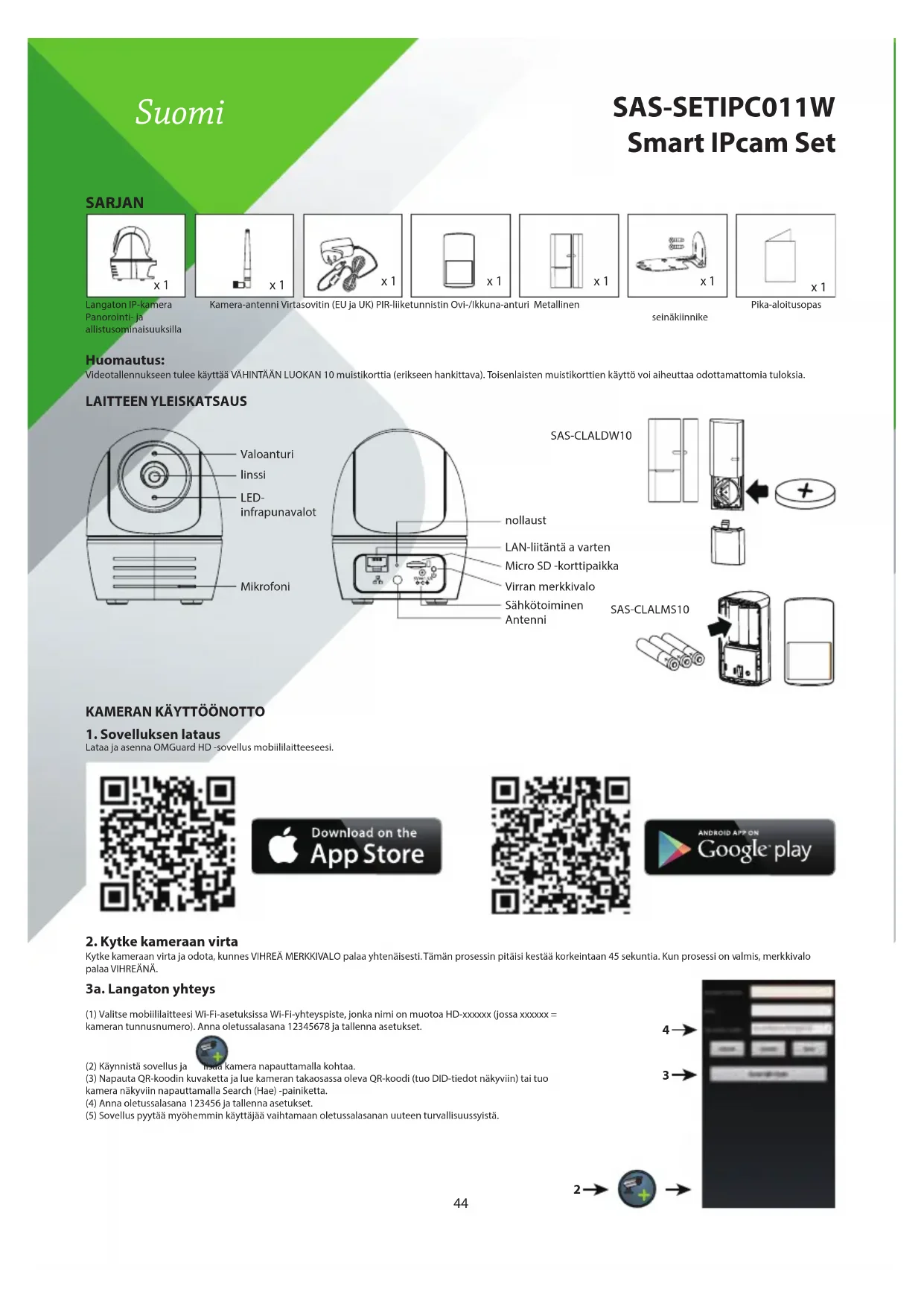 SAS-SETIPC011W Smart IPcam Set Suomi Langaton IP-kamera Panorointi- ja allistusominaisuuksilla Kamera-antenni Virtasovitin (EU ja UK) PIR-liiketunnistin Ovi-/Ikkuna-anturi Metallinen seinäkiinnikePika-aloitusopas45 3b. Langallinen (1) Varmista, että mobiililaitteesi on yhdistetty Wi-Fi-verkkoon. (2) Yhdistä kamera Wi-Fi-reitittimeen Ethernet-kaapelilla. (3) Käynnistä sovellus ja tuo kamera näkyviin napauttamalla Search (Hae) -painiketta. (4) Anna oletussalasana 123456 ja tallenna asetukset. (5) Sovellus pyytää myöhemmin käyttäjää vaihtamaan oletussalasanan uuteen turvallisuussyistä. Huomautus: VIHREÄ MERKKIVALO palaa Soft AP -tilassa kerran pitkään ja vilkkuu sitten kaksi kertaa lyhyesti. Normaalitilassa merkkivalo vilkkuu vihreänä. Lisätietoja on käyttöoppaassa.
