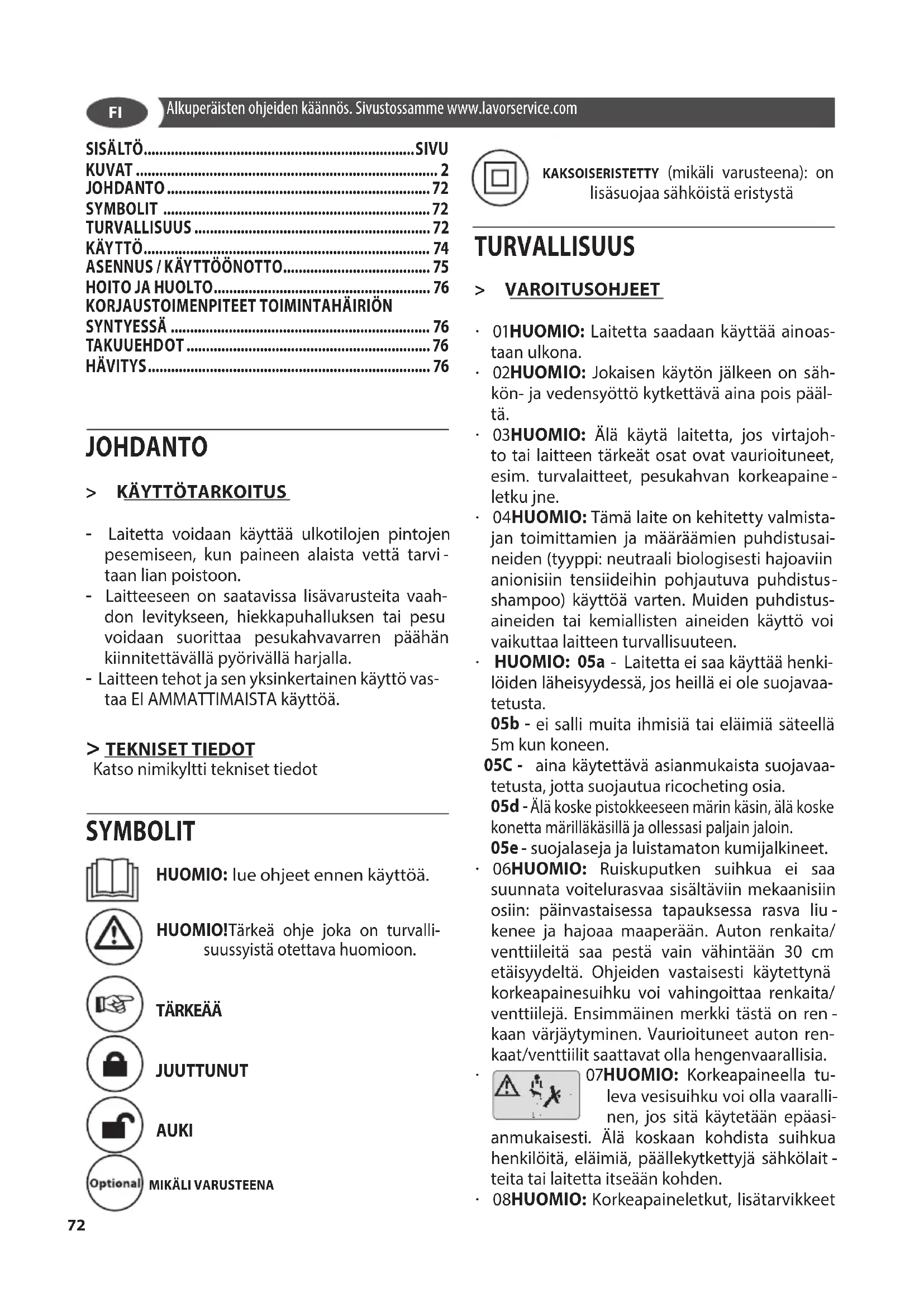 peräisiä tai valmistajan suosittelemia varaosia. TAKUUEHDOT Kaikki valmistamamme laitteet on testattu huolellisesti ja niille annetaan takuu valmistus- vikoja vastaan voimassa olevan lain mukaan. Takuu on voimassa ostopäivästä alkaen. Takuu ei koske: - liikkuvia, kuluvia osia - kumi osat, hiiliharjat kivihiili, suodattimet, ja lisäva- rusteet, ja optional lisävarusteet. - Satunnaisia vaurioita ja vaurioita, jotka ovat aiheutuneet kuljetuksessa, huolimattomuudesta tai vääräs- tä käsittelystä, väärästä ja tarkoituksen vastai- sesta käytöstä ja asennuksesta, - Takuu ei si- sällä toimivien osien mahdollisesti tarpeellista puhdistusta, suodattimet tukkiutunee, tukkiu- tuneet suuttimet, kalkin muodostumisen vuok- si lukittuneet laitteet, Laite on tarkoitettu kotikäyttöön EI AMMATTI- KÄYTTÖÖN. takuu ei kata mitään muuta käyt- töä. HÄVITYS Laki (EU:n direktiivin 2012/19/EU mu- kaan, sähkö- tai elektronisten laitteiden jätteistä ja EU:n jäsenvaltioiden kansallis- ten lainsäädäntöjen mukaisesti, jotka ovat panneet direktiivin täytäntöön) kieltää sähköisen tai elektronisen laitteen omistajaa, tämän tuotteen tai sen sähköisten- tai elektro- nisten laitteiden hävittämisen kotitalouksien kiinteinä yhdyskuntajätteinä ja kehoittaa sen sijaan niiden hävittämistä niille tarkoitetuissa keruukeskuksissa. Valmistaja voi hävittää suo- raan hävitettävän tuotteen jos hankittava uusi tuote on samanarvoinen hävitettävän tuotteen kanssa. Jos tuote jätetään ympäristöön, se saat-FI
